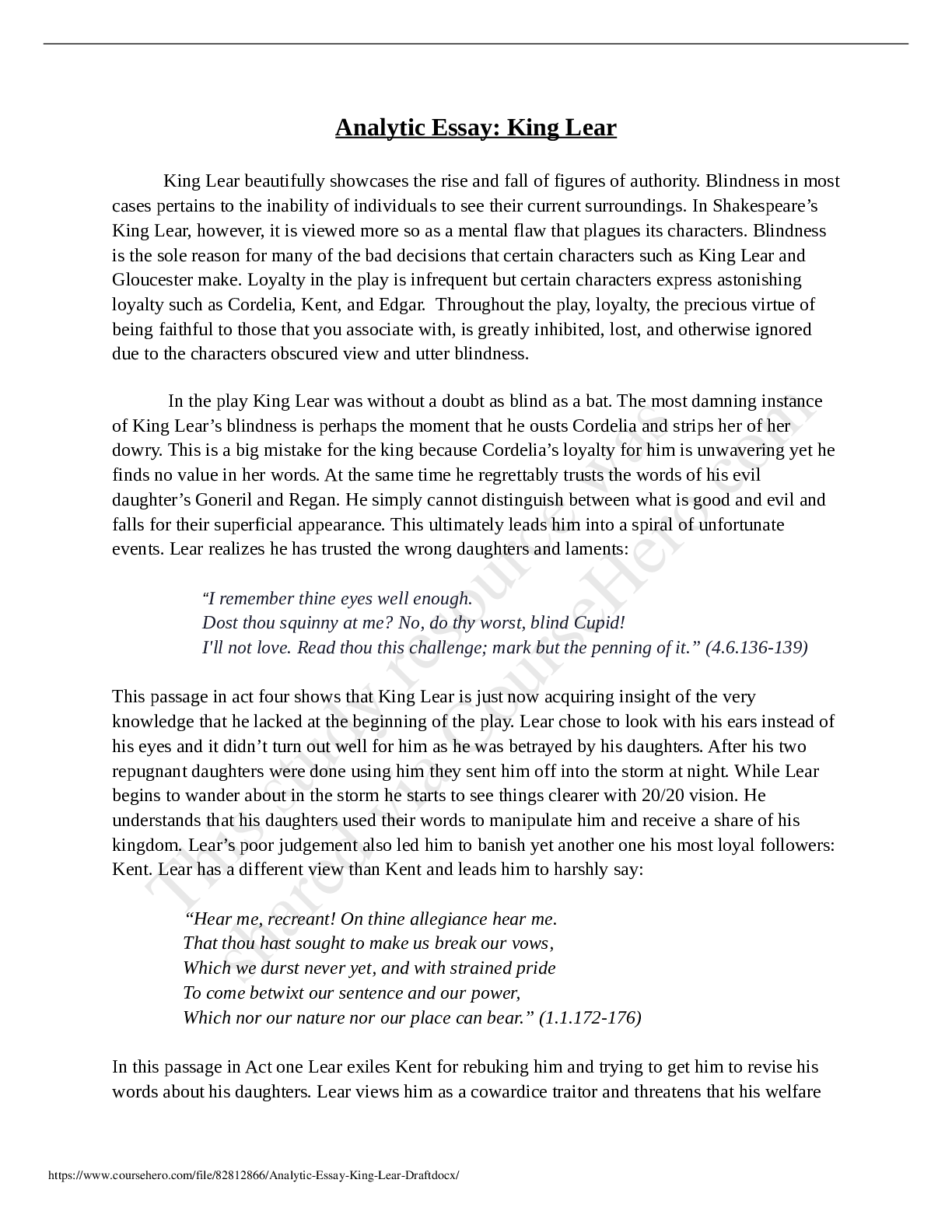 Literary Studies > ESSAY > Compass High School - ENGLISH 101Analytic Essay_ King Lear Draft (All)