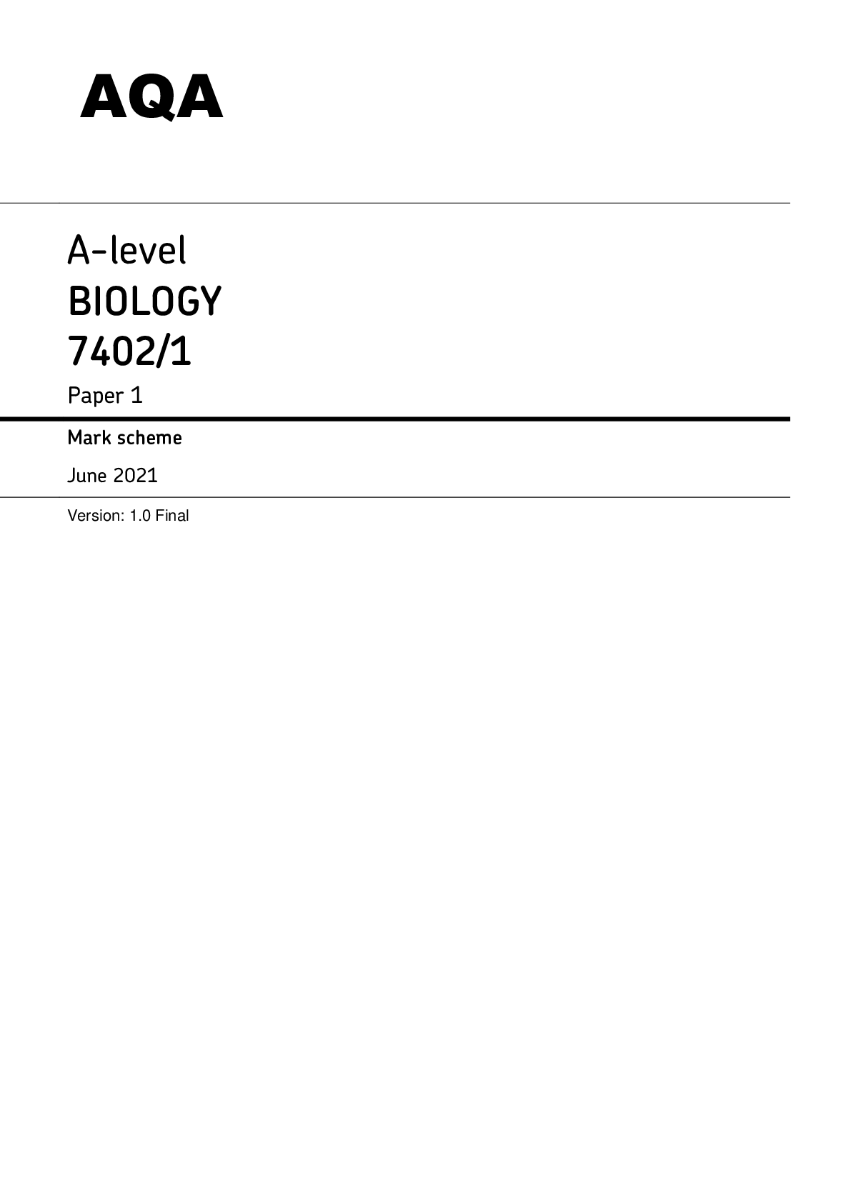 Biology > A/As Level Mark Scheme > AQA A Level Biology 7402/1 Paper 1 Mark Scheme June 2021 Version 1.0 Final (All)