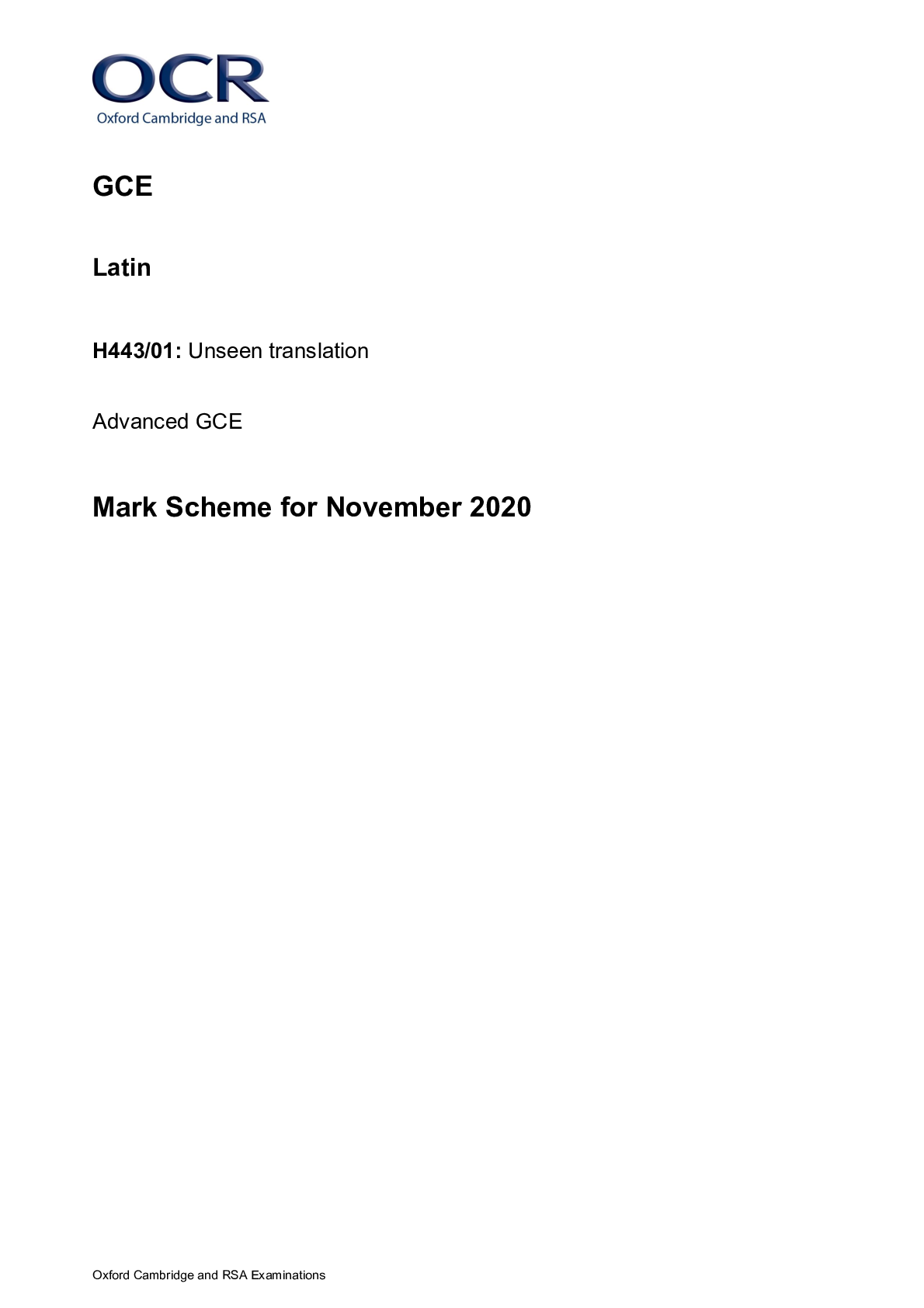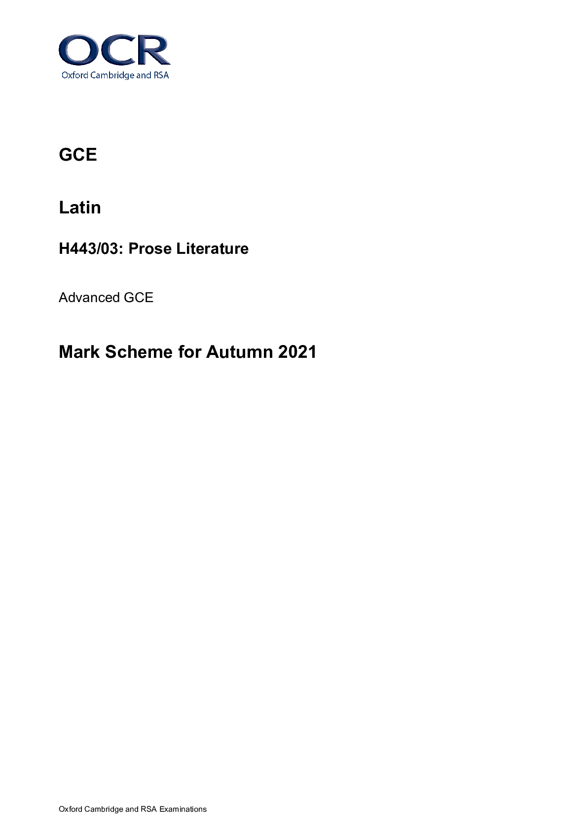 Latin > A/As Level Mark Scheme > GCE Latin H443/01: Unseen translation Advanced GCE Mark Scheme for Autumn 2021. Rated A+. Download To Score A+ (All)