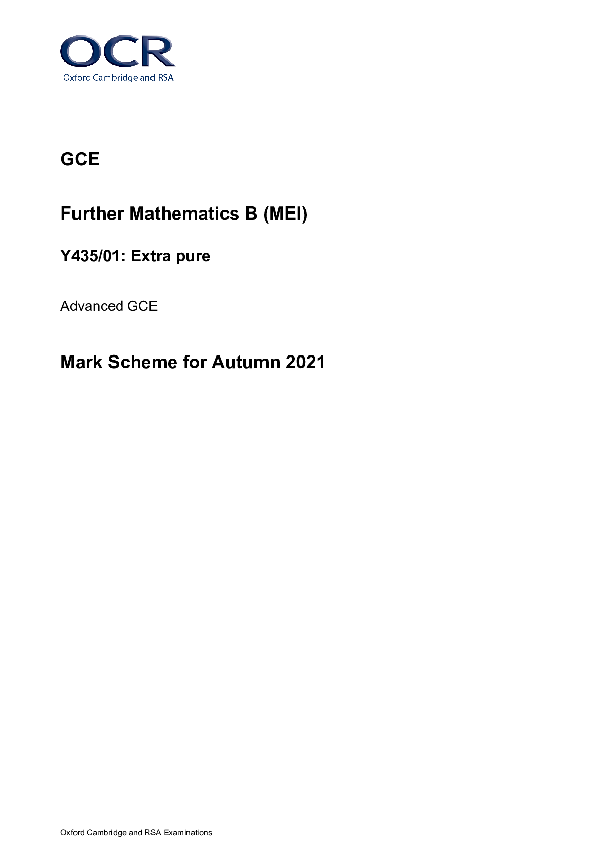 Mathematics > A/As Level Mark Scheme > GCE Further Mathematics B (MEI) Y435/01: Extra pure Advanced GCE Mark Scheme for Autumn 2021 (All)