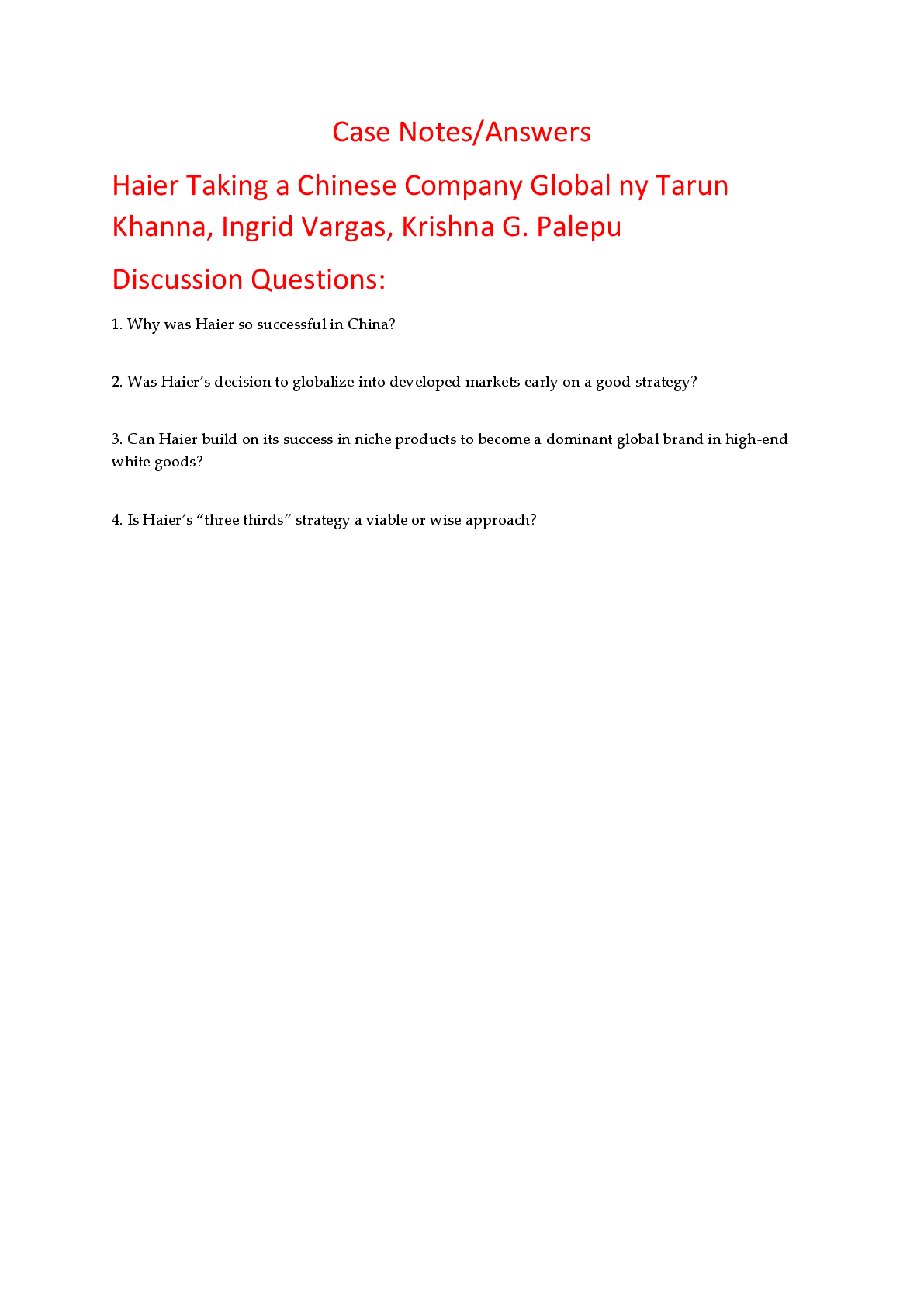 Education > HARVARD CASE SOLUTIONS > Case Notes/Answers Haier Taking a Chinese Company Global ny Tarun Khanna, Ingrid Vargas, Krishna G. Palepu (All)