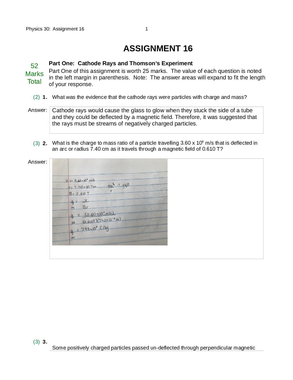 Physics > QUESTIONS & ANSWERS > PHYSICS 30>Assignment 16( With 2 parts:Part One: Cathode Rays and Thomson’s Experiment and Part Two: The Millikan Experiment) < VERIFIED SCREENSHOTED ANSWERS > (All)