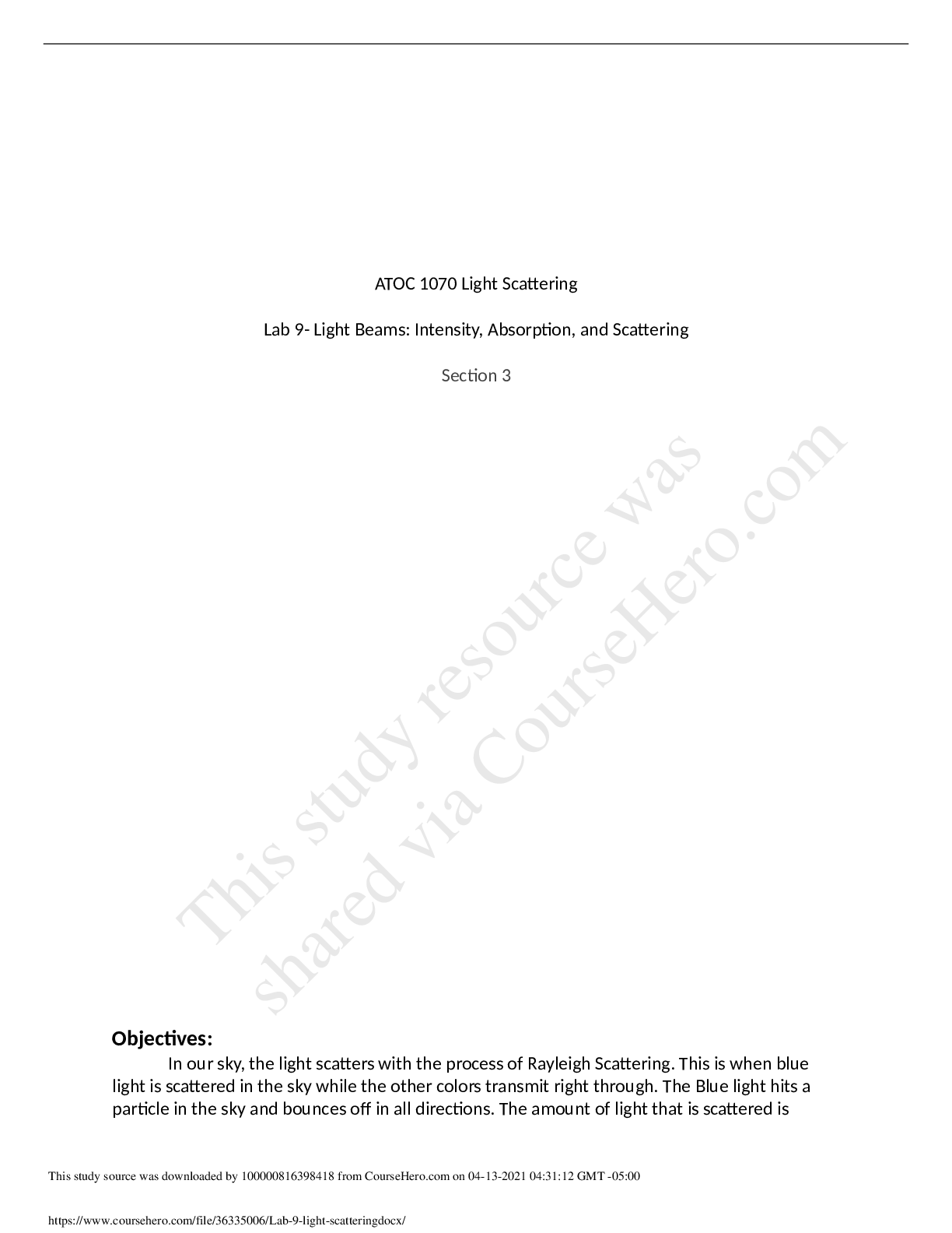 Physics > Lab Report > University of Colorado, Boulder - ATOC 1070Lab 9 light scattering (All)