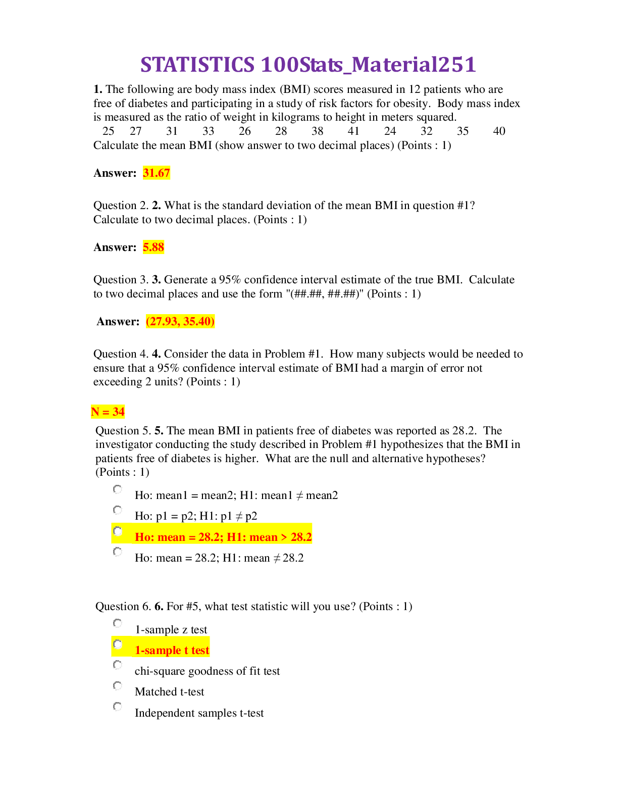 Statistics > QUESTIONS & ANSWERS > STATISTICS 100 Stats_Material 251. Questions and Answers. 100% Correct. (All)