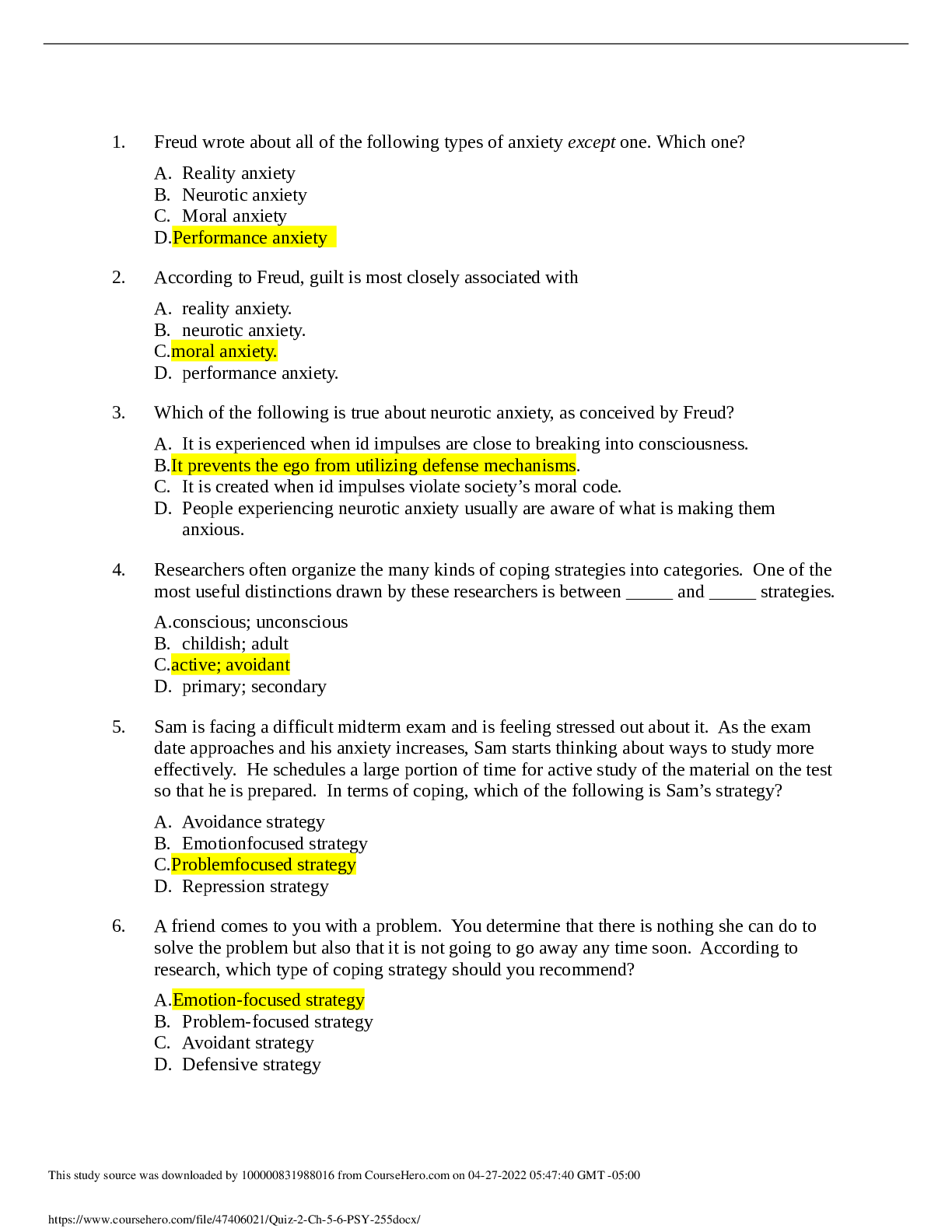 Physiology > EXAM REVIEW > NUR 2212, PHSYCHOLOGY EAQ** | Answers Correctly Marked (100 % CORRECT) (All)