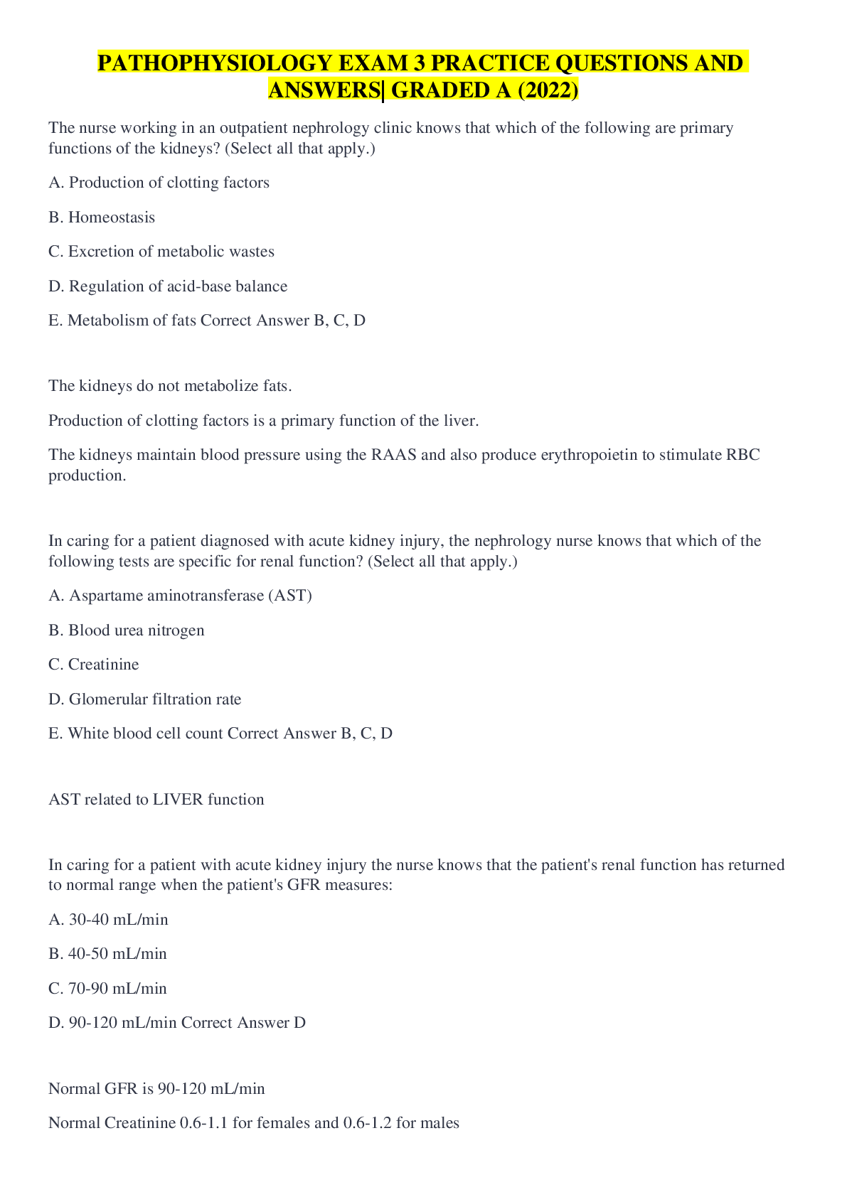 Physiology > QUESTIONS & ANSWERS > PATHOPHYSIOLOGY EXAM 3 PRACTICE QUESTIONS AND ANSWERS| GRADED A (2022) (All)