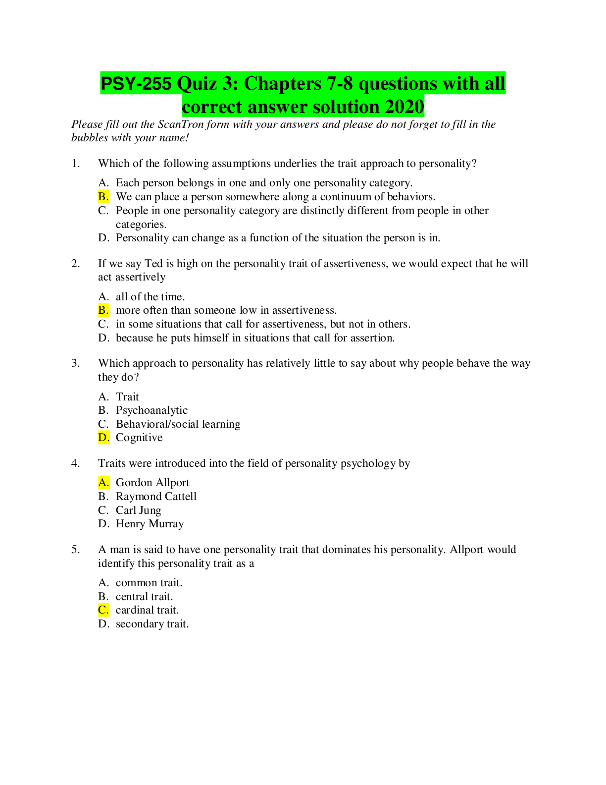 Physiology > QUESTIONS & ANSWERS > PSY-255 Quiz 3: Chapters 7-8 questions with all correct answer solution 2020 (All)