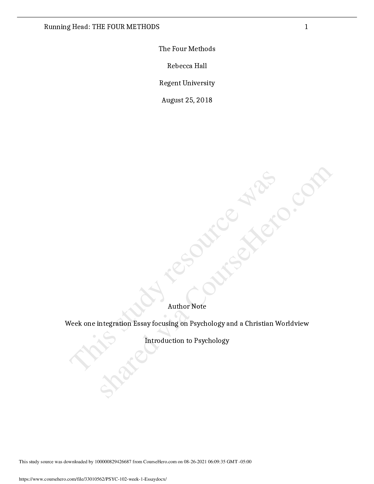 Physiology > ESSAY > PSYC 102PSYC 102 week 1 Essay The Four Methods Rebecca Hall Regent University August 25, 2018 Author Note Week one integration Essay focusing on Psychology and a Christian Worldview Introduction to Psychology (All)