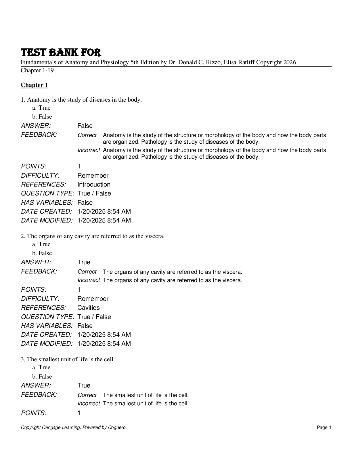 Physiology > TEST BANKS > Test Bank For Fundamentals of Anatomy and Physiology 5th Edition by Dr. Donald C. Rizzo, Elisa Ratliff Copyright 2026 (All)
