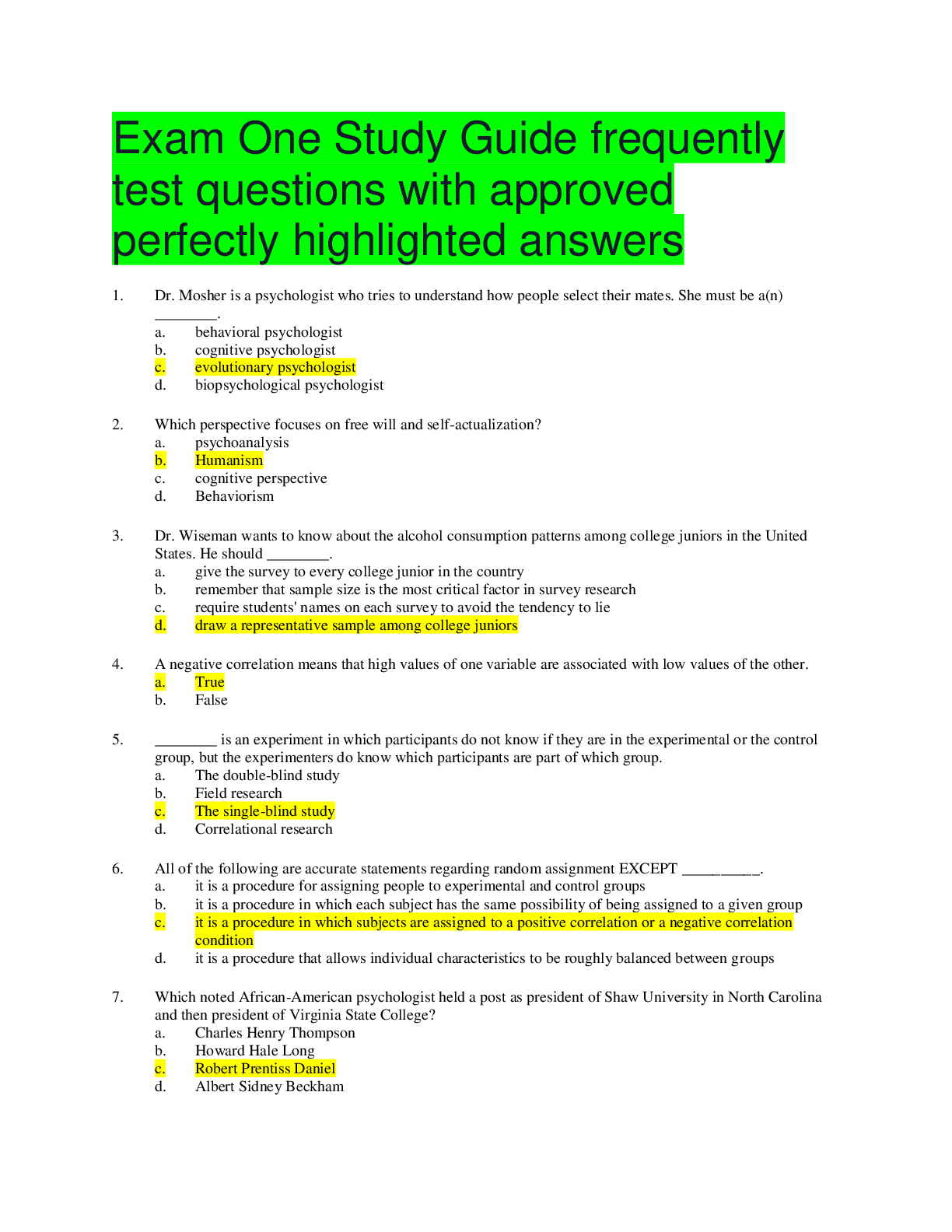 Physiology > QUESTIONS & ANSWERS > Exam One Study Guide frequently test questions with approved perfectly highlighted answers (All)