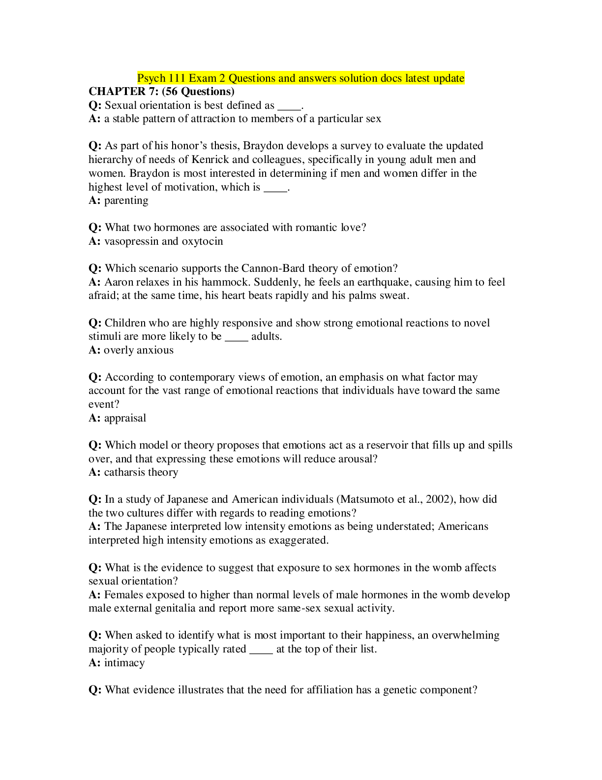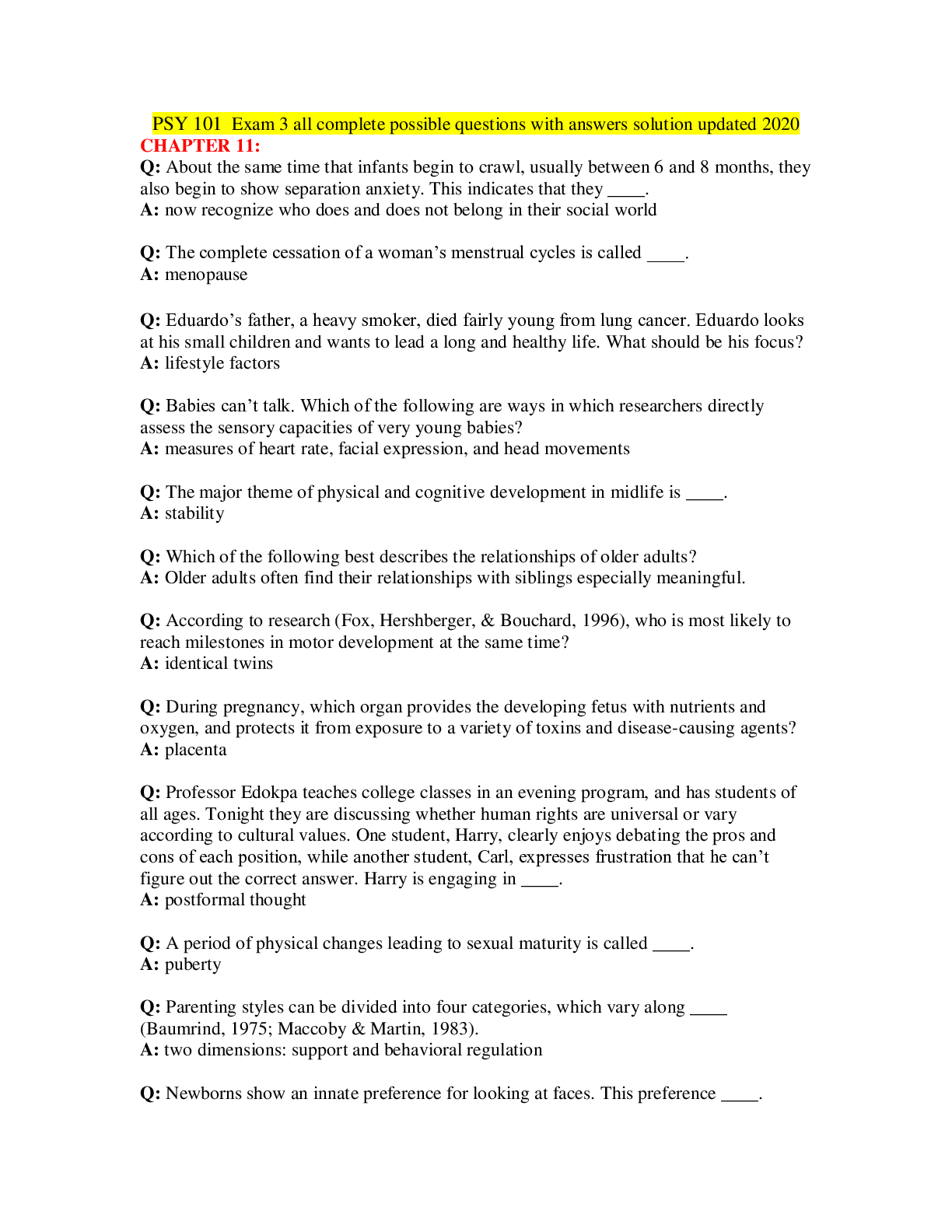 Physiology > QUESTIONS & ANSWERS > PSY 101 Exam 3 all complete possible questions with answers solution updated 2020 (All)