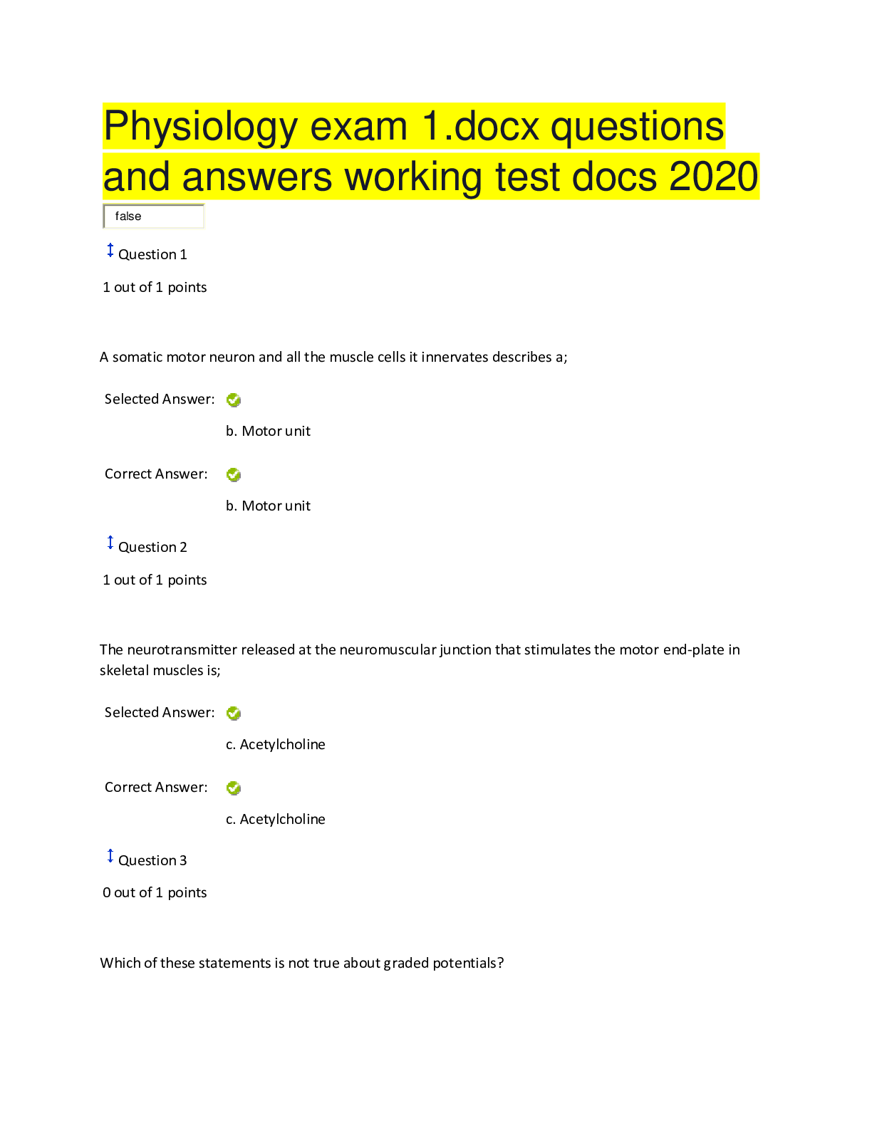 Physiology > QUESTIONS & ANSWERS > Physiology exam 1.docx questions and answers working test docs 2020 (All)