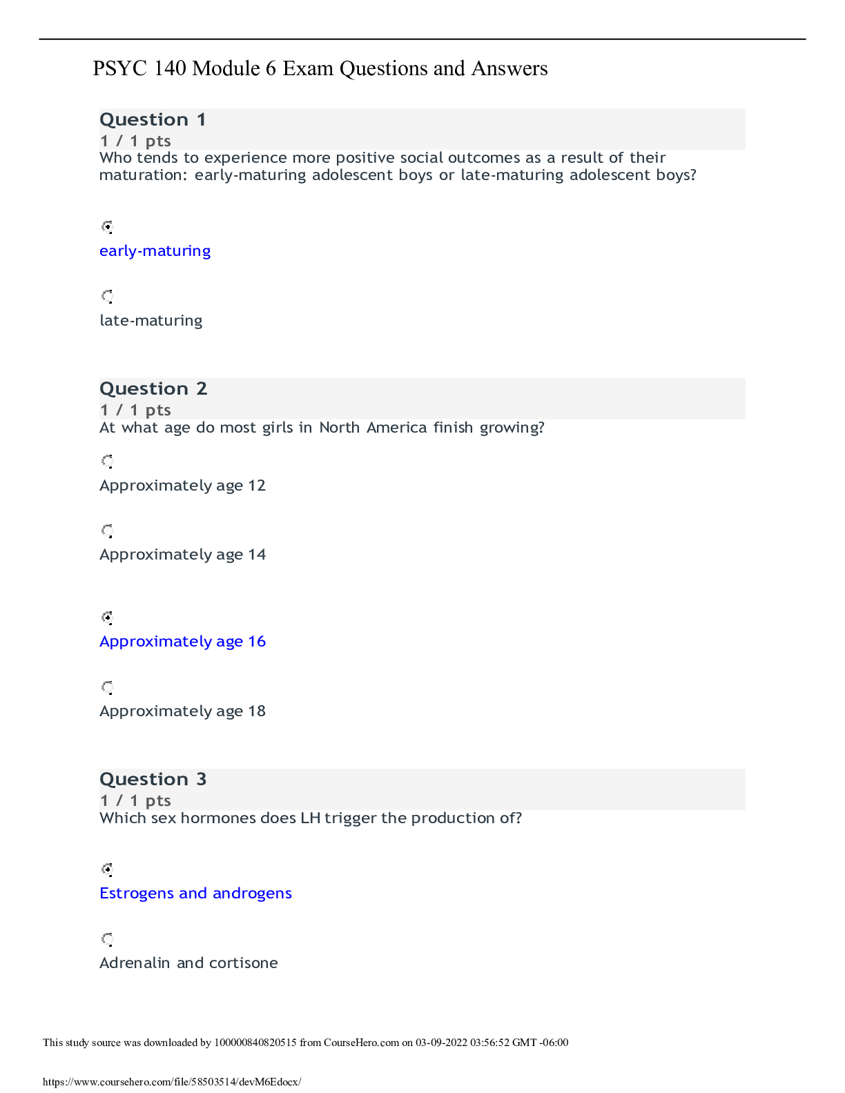 Physiology > EXAM > PSYC 140 Module 6 Exam Questions and Answers (All)