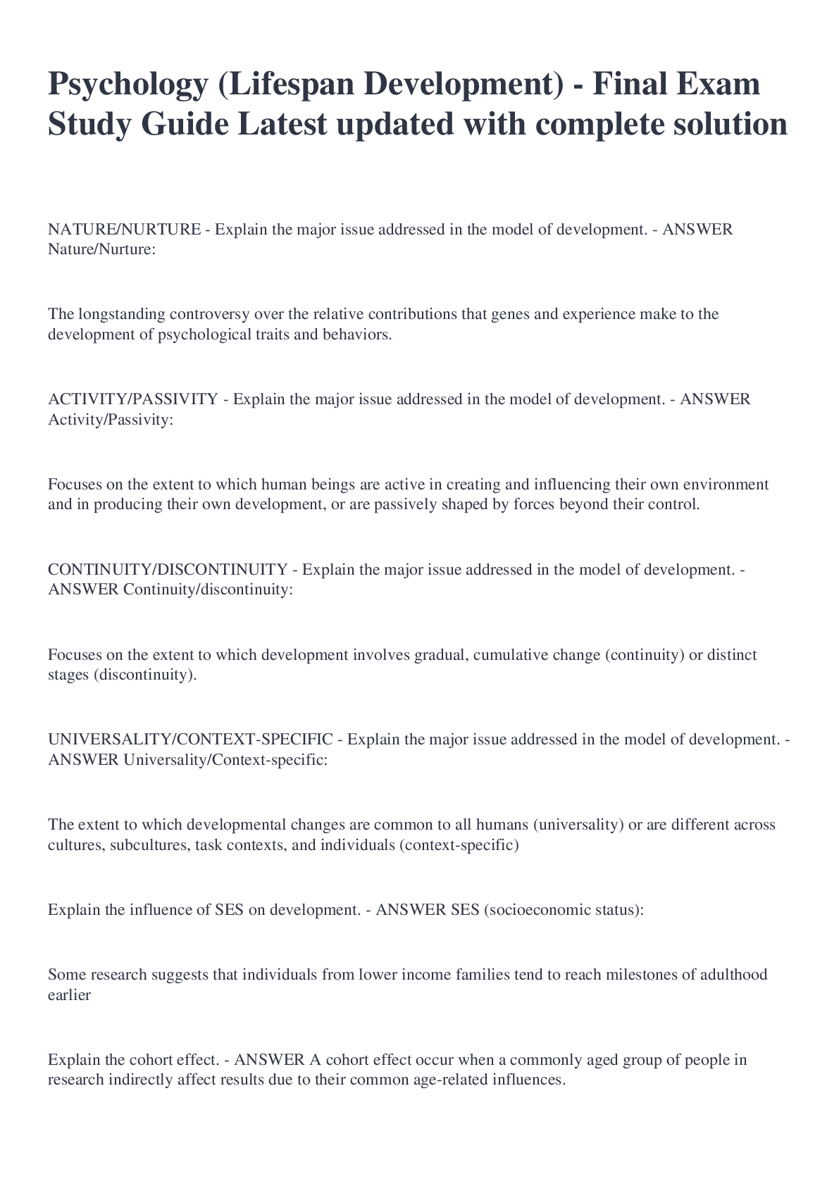 Physiology > EXAM > Psychology (Lifespan Development) - Final Exam Study Guide Latest updated with complete solution (All)