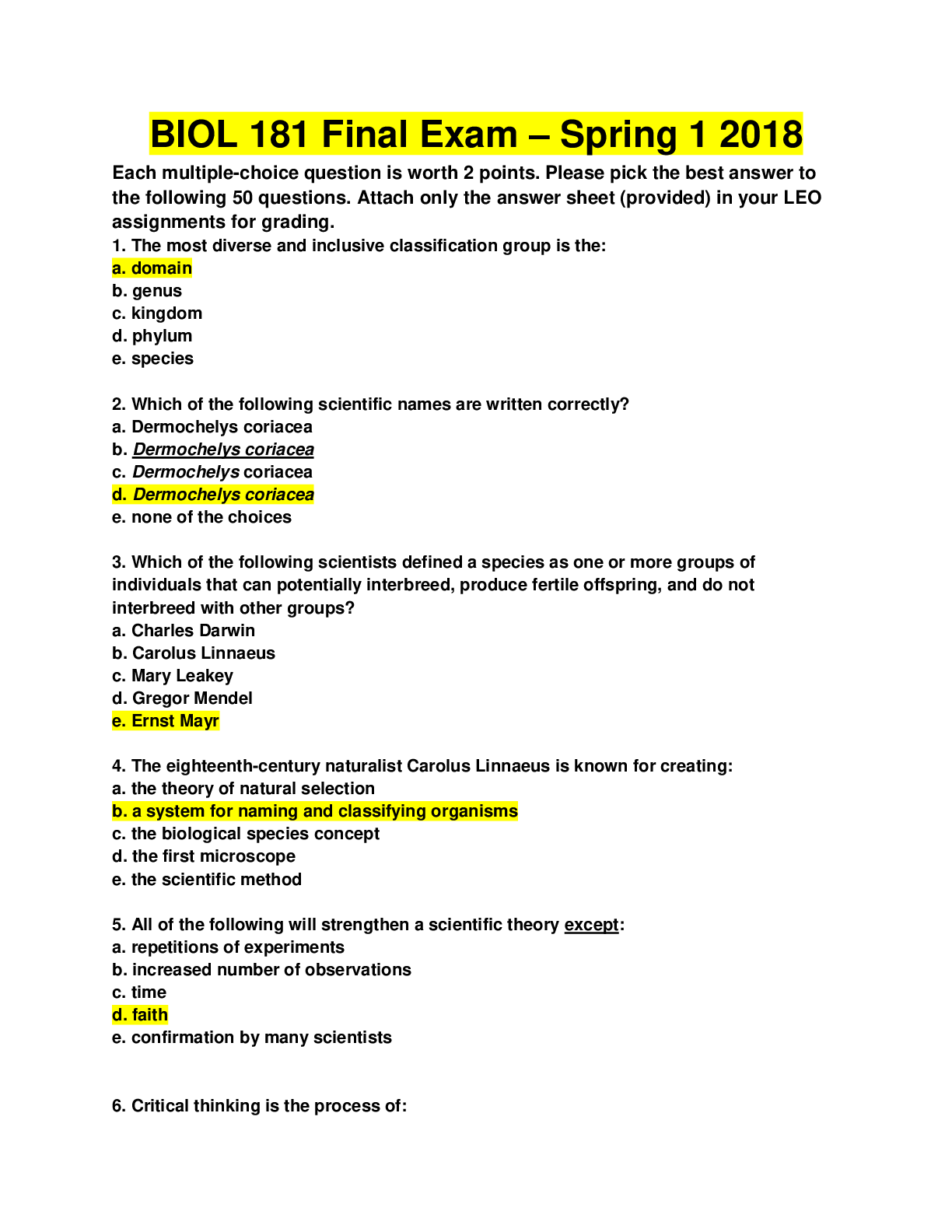 Biology > EXAM > BIOL 181 Final Exam Questions & Answers (All)