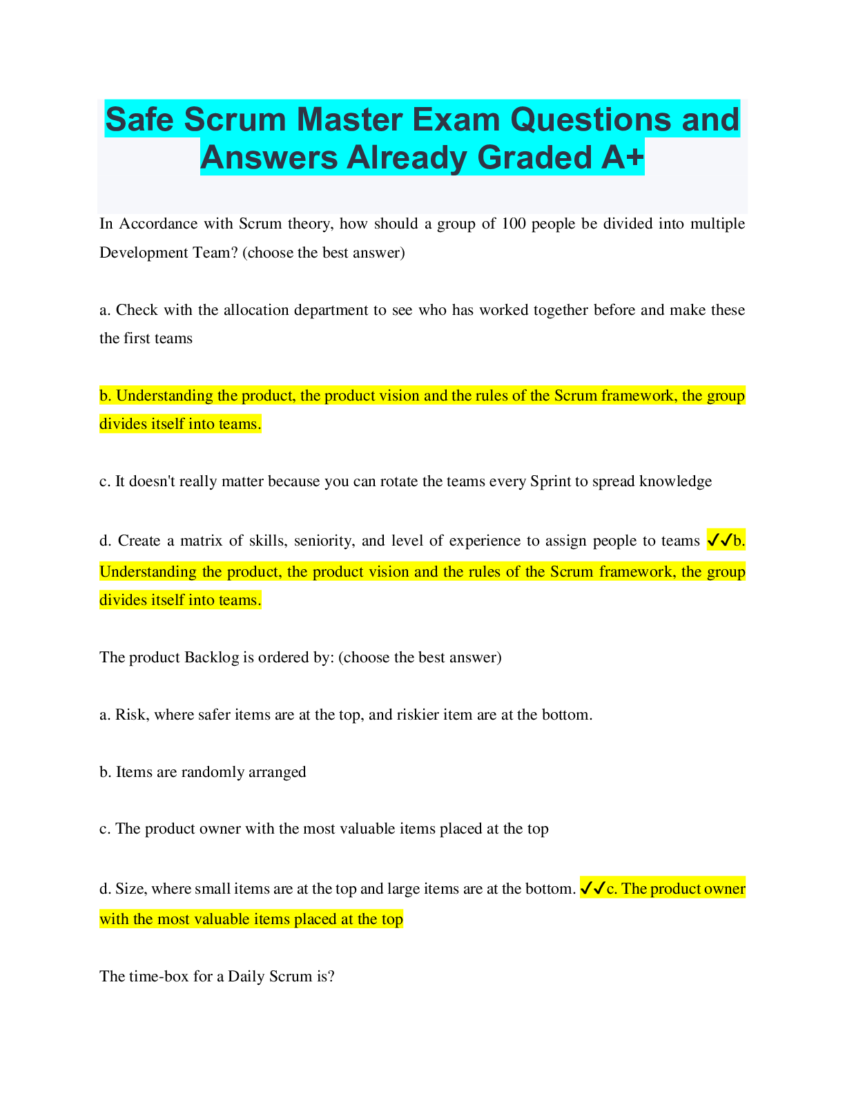 Project Management > EXAM > Safe Scrum Master Exam Questions and Answers Already Graded A+ (All)