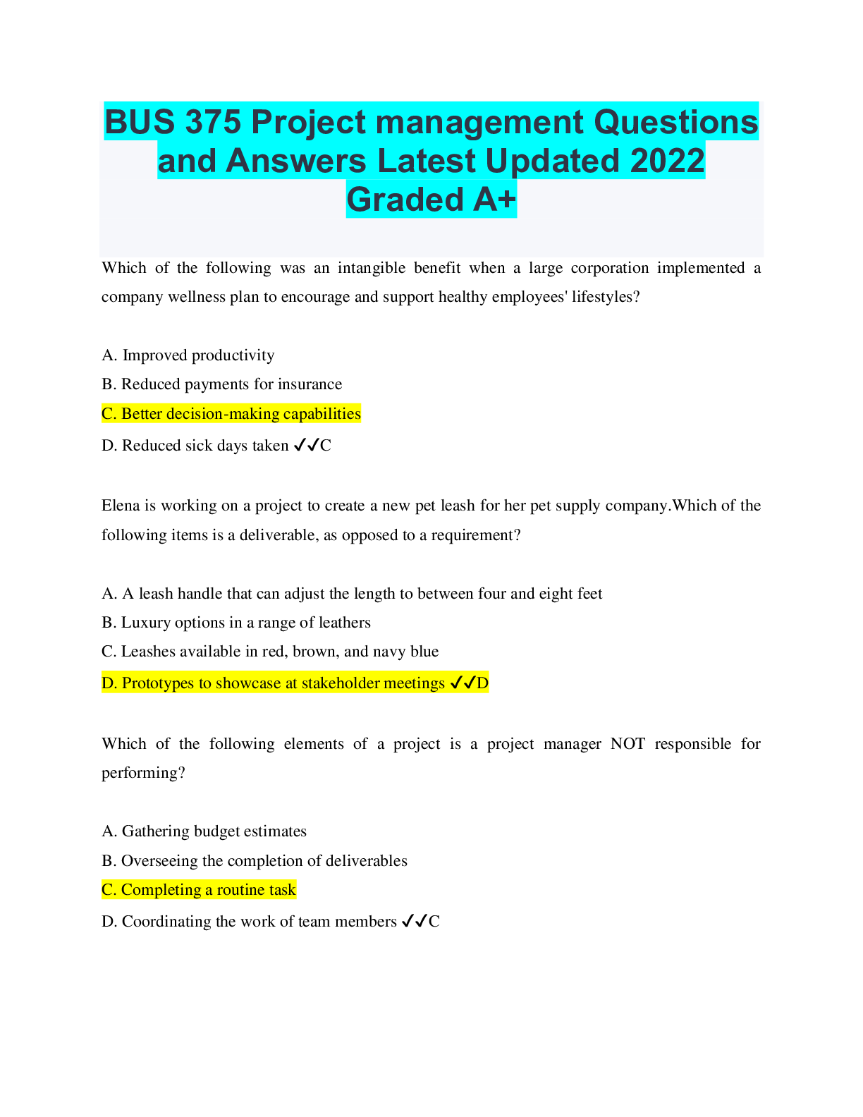 Project Management > EXAM > BUS 375 Project management Questions and Answers Latest Updated 2022 Graded A+ (All)