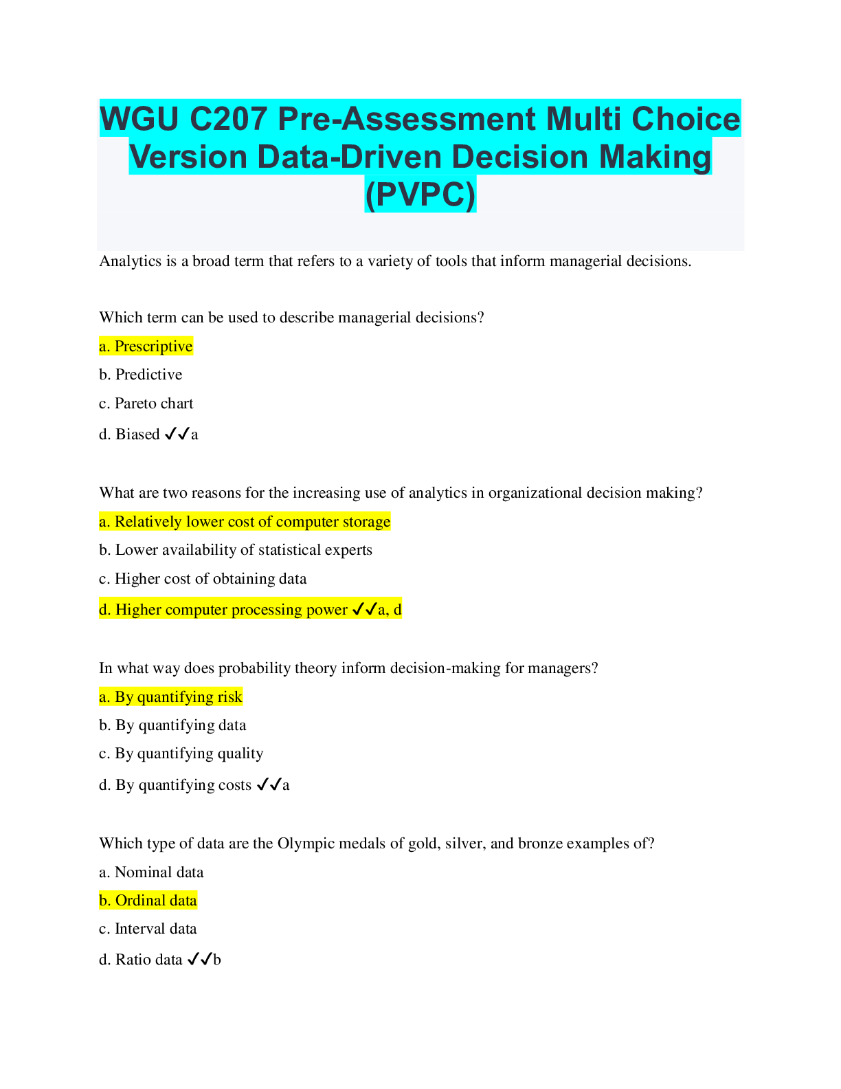 Project Management > EXAM > WGU C207 Pre-Assessment Multi Choice Version Data-Driven Decision Making (PVPC) (All)