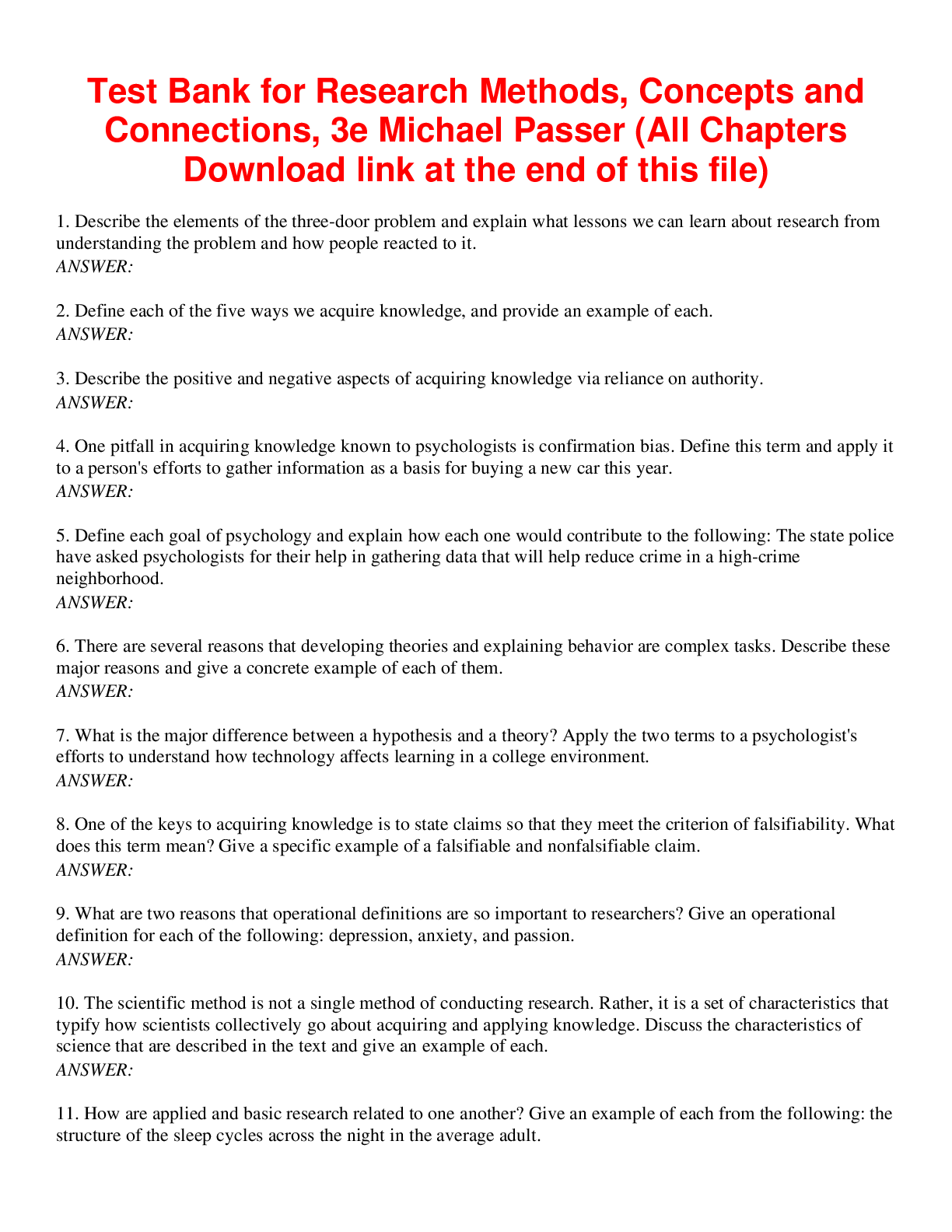Research Methods > TEST BANKS > Research Methods, Concepts and Connections, 3e Michael Passer (Test Bank) (All)