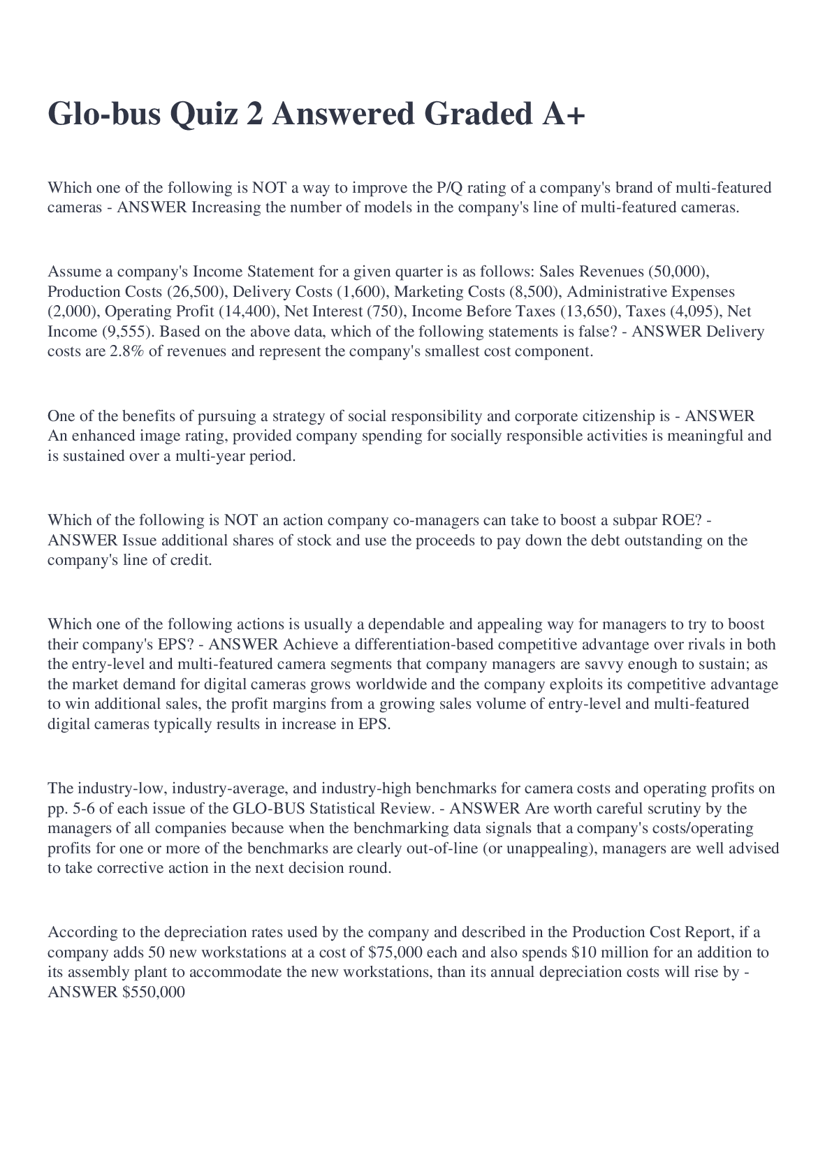 Business Research > QUESTIONS & ANSWERS > Glo-bus Quiz 2 questions and answers 2022 (All)