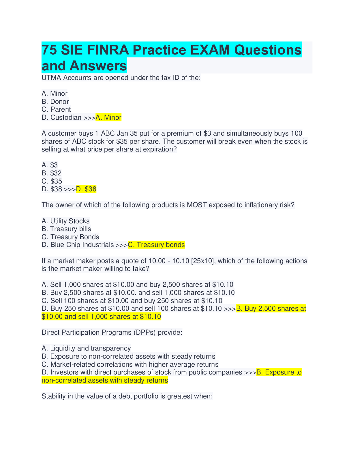 Film Studies > QUESTIONS & ANSWERS > 75 SIE FINRA Practice EXAM Questions and Answers (All)