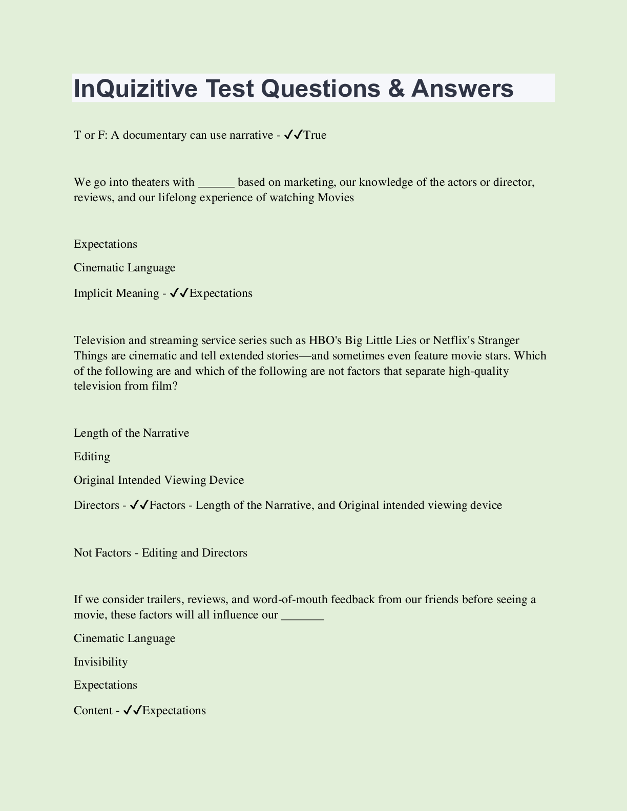 Film Studies > QUESTIONS & ANSWERS > InQuizitive Test Questions & Answers | 80 Questions with 100% Correct Answers | Updated & Verified | 23 Pages (All)