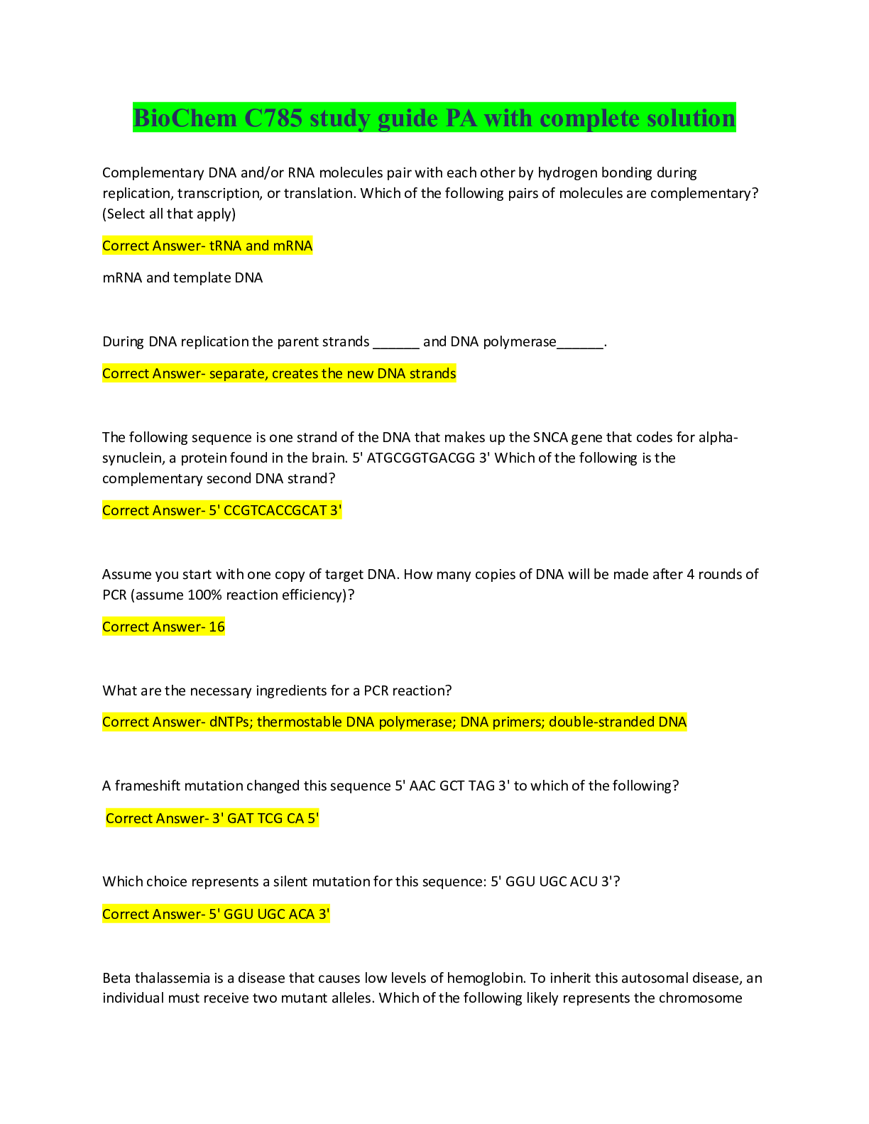 BioChemistry > EXAM > BioChem C785 study guide PA with complete solution (All)