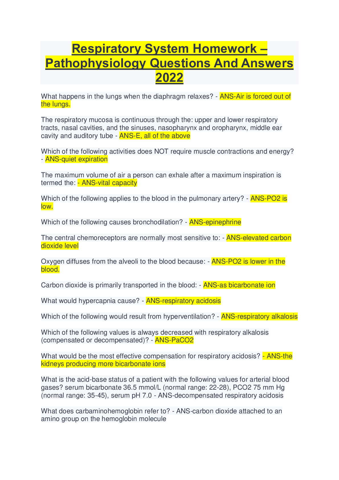 Pathophysiology > EXAM > Respiratory System Homework – Pathophysiology Questions And Answers 2022 (All)
