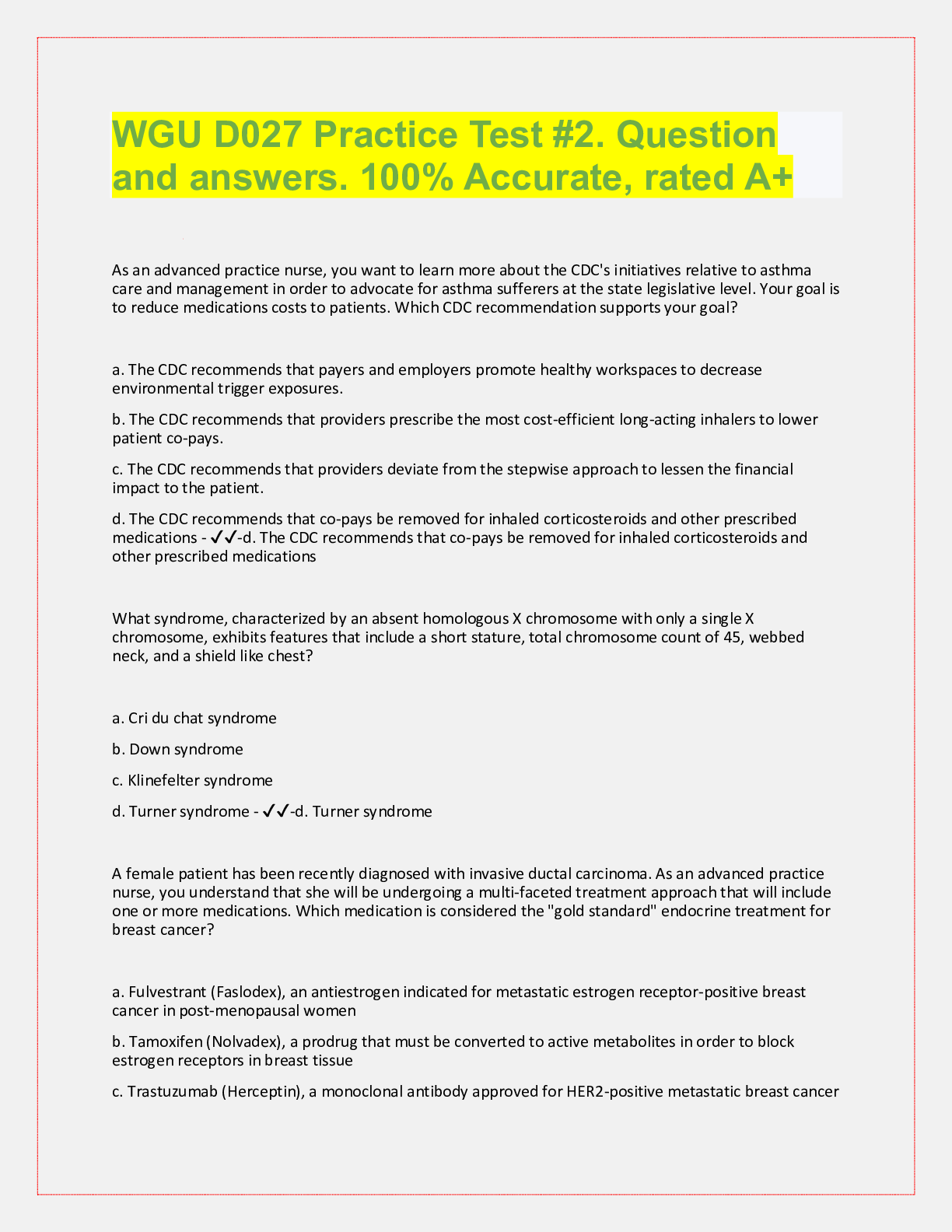 Pathophysiology > QUESTIONS & ANSWERS > WGU D027 Practice Test #2. Question and answers. 100% Accurate, rated A+ (All)