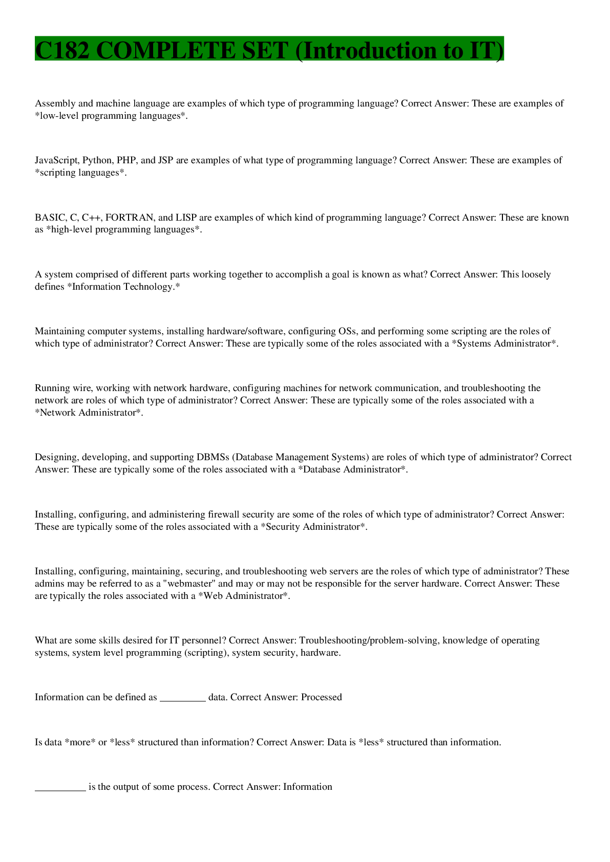 Information Technology > EXAM > C182 COMPLETE SET (Introduction to IT) QUESTIONS AND ANSWERS ALL CORRECT (All)