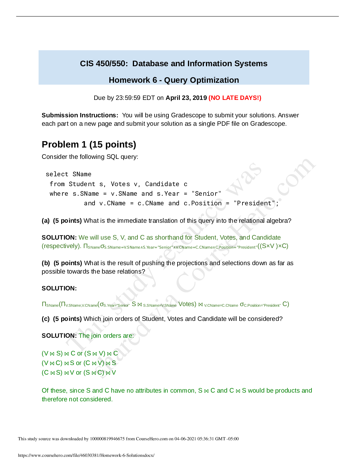 Information Technology > QUESTIONS & ANSWERS > CIS 450/550: Database and Information Systems Homework 6 - Query Optimization ( 100% COMPLETE AND CORRECT SOLUTIONS) (All)