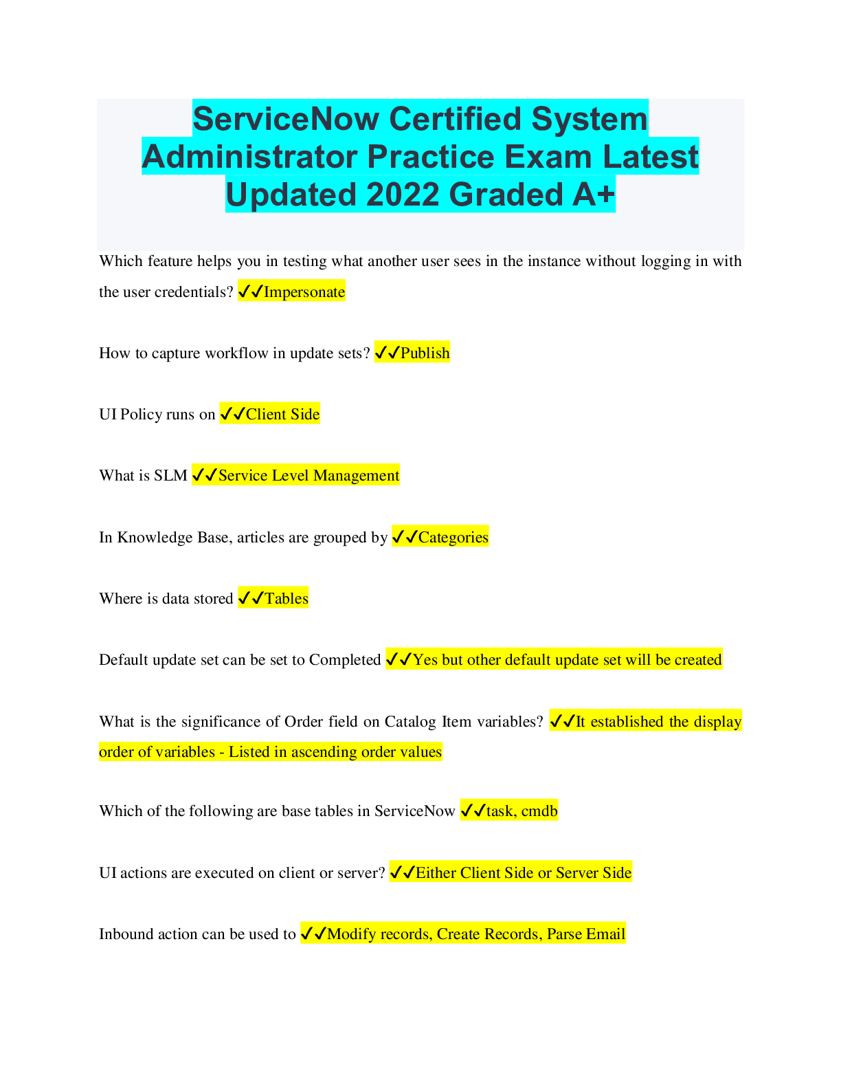 Information Technology > EXAM > ServiceNow Certified System Administrator Practice Exam Latest Updated 2022 Graded A+ (All)