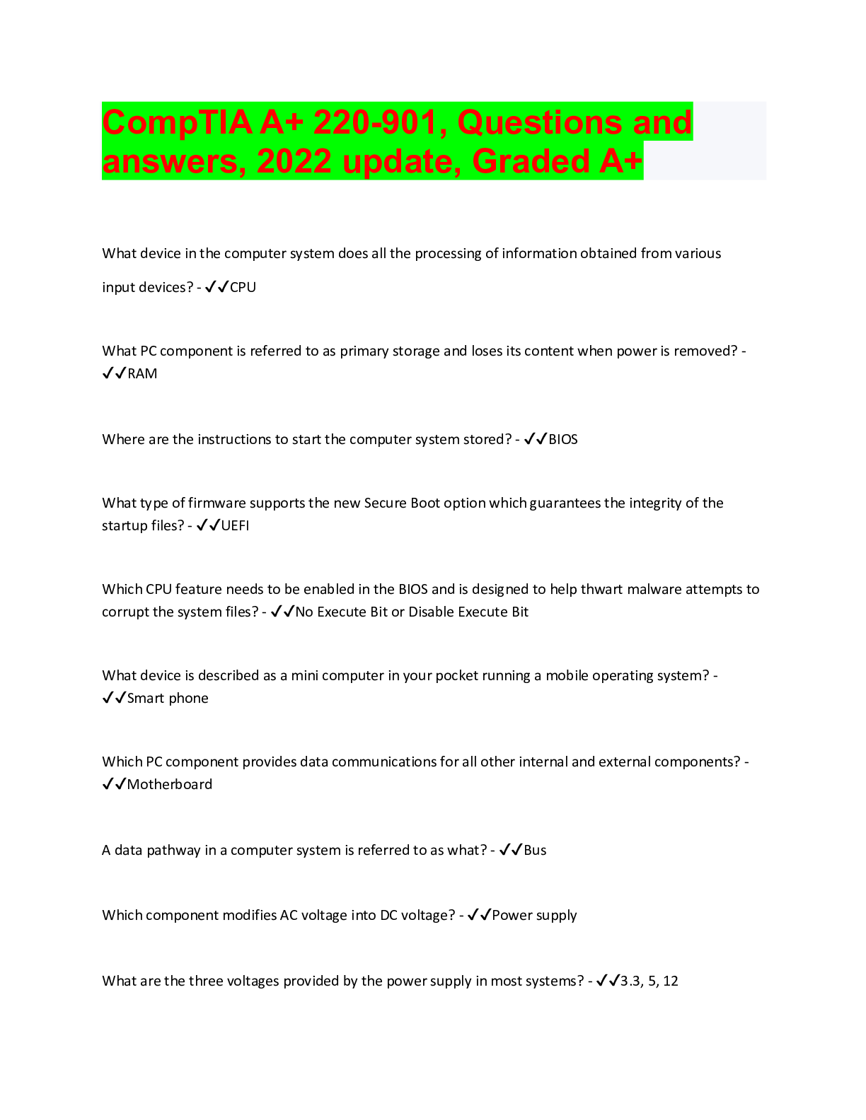 Information Technology > QUESTIONS & ANSWERS > 220-901: CompTIA A+ Certification Exam Questions and answers, 2022. Graded A+ (All)