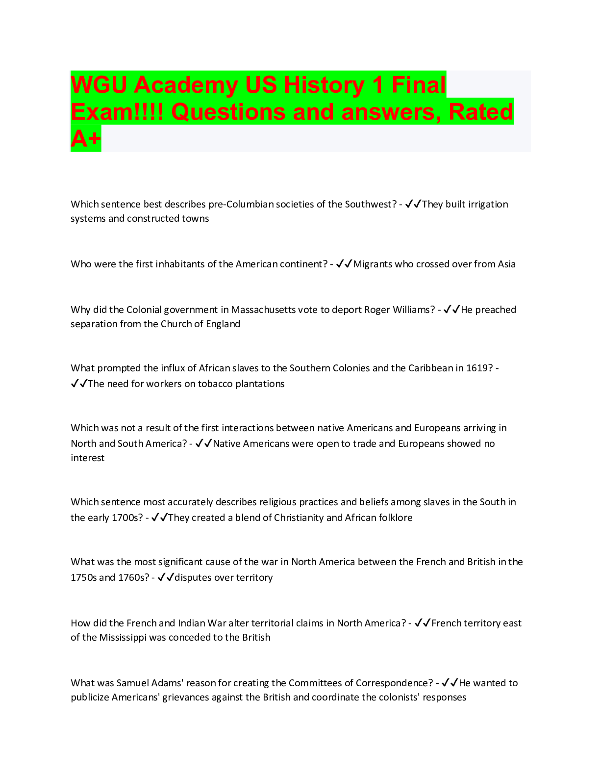 Information Technology > QUESTIONS & ANSWERS > WGU Academy US History 1 Final Exam!!!! Questions and answers, Rated A+ (All)