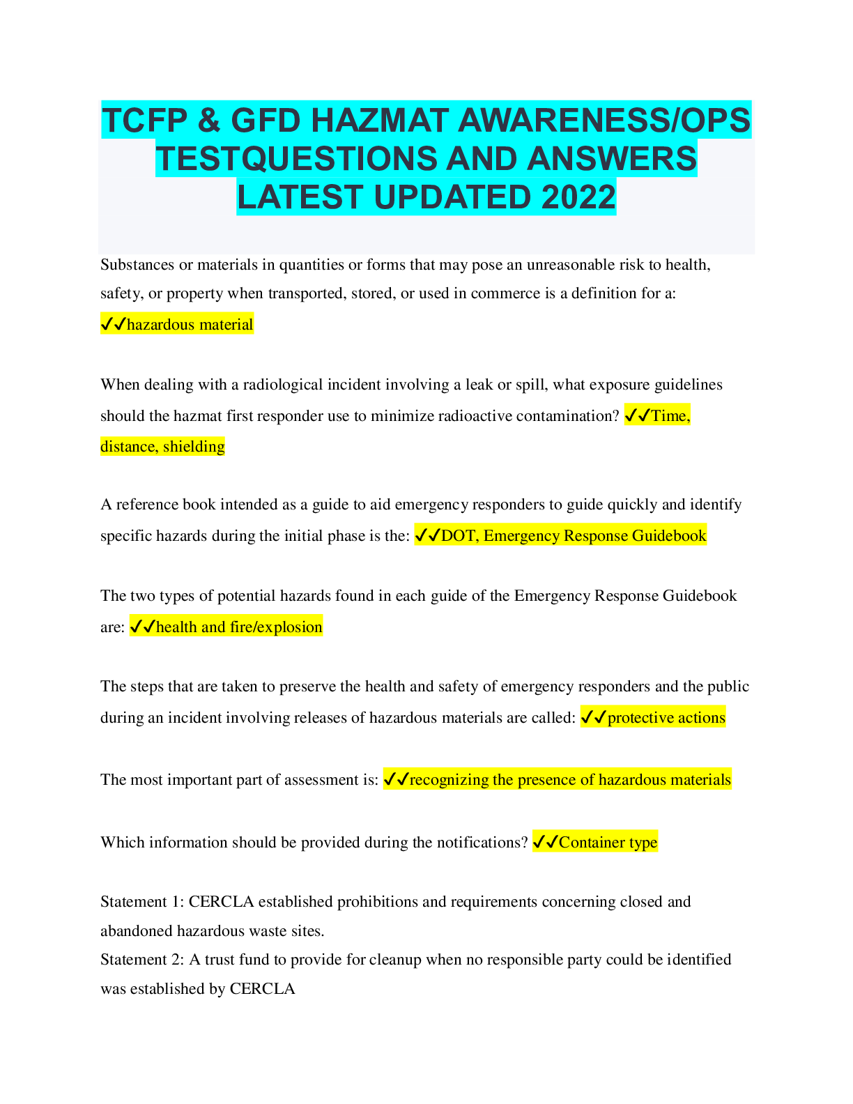 Information Technology > EXAM > TCFP & GFD HAZMAT AWARENESS/OPS TESTQUESTIONS AND ANSWERS LATEST UPDATED 2022 (All)