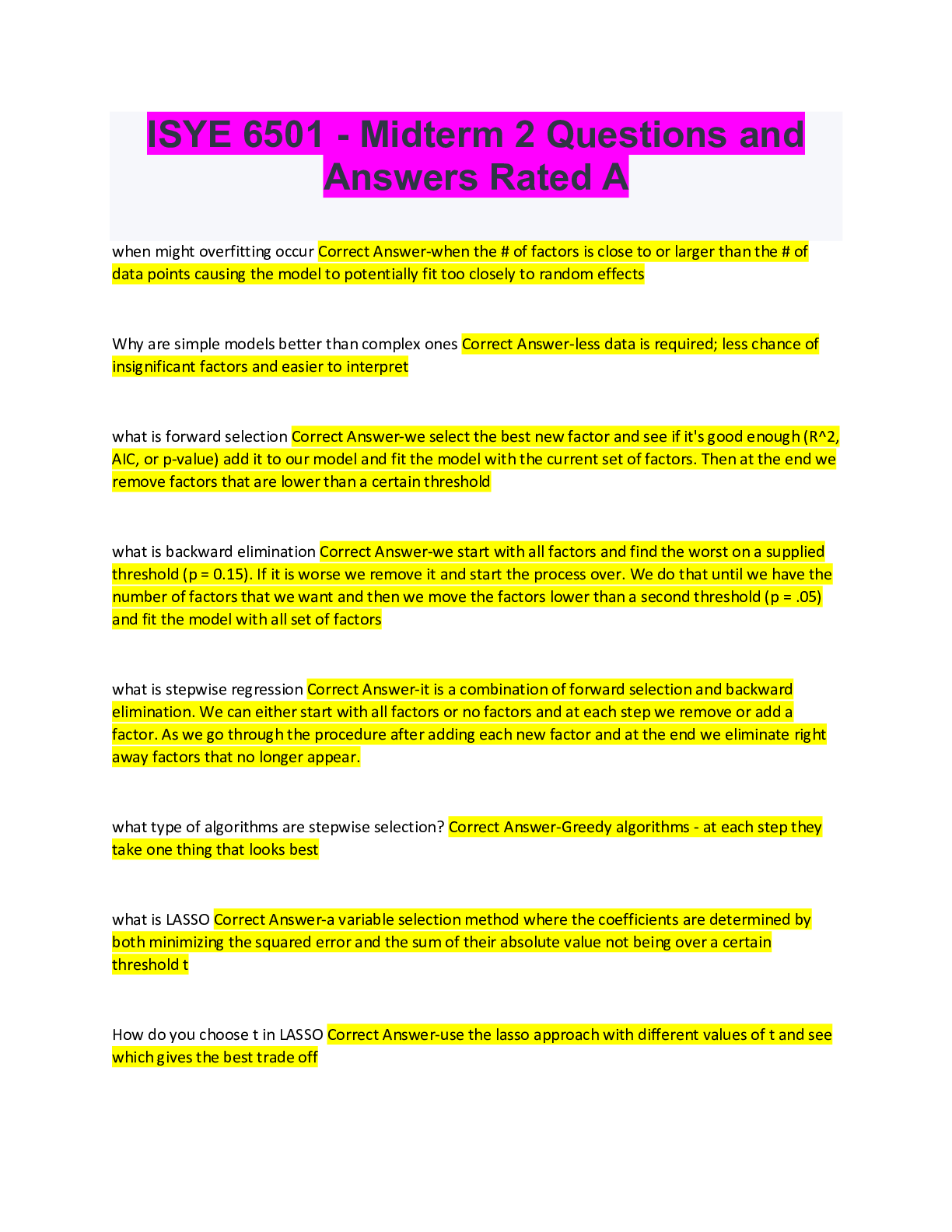 Information Technology > EXAM > ISYE 6501 - Midterm 2 Questions and Answers Rated A (All)