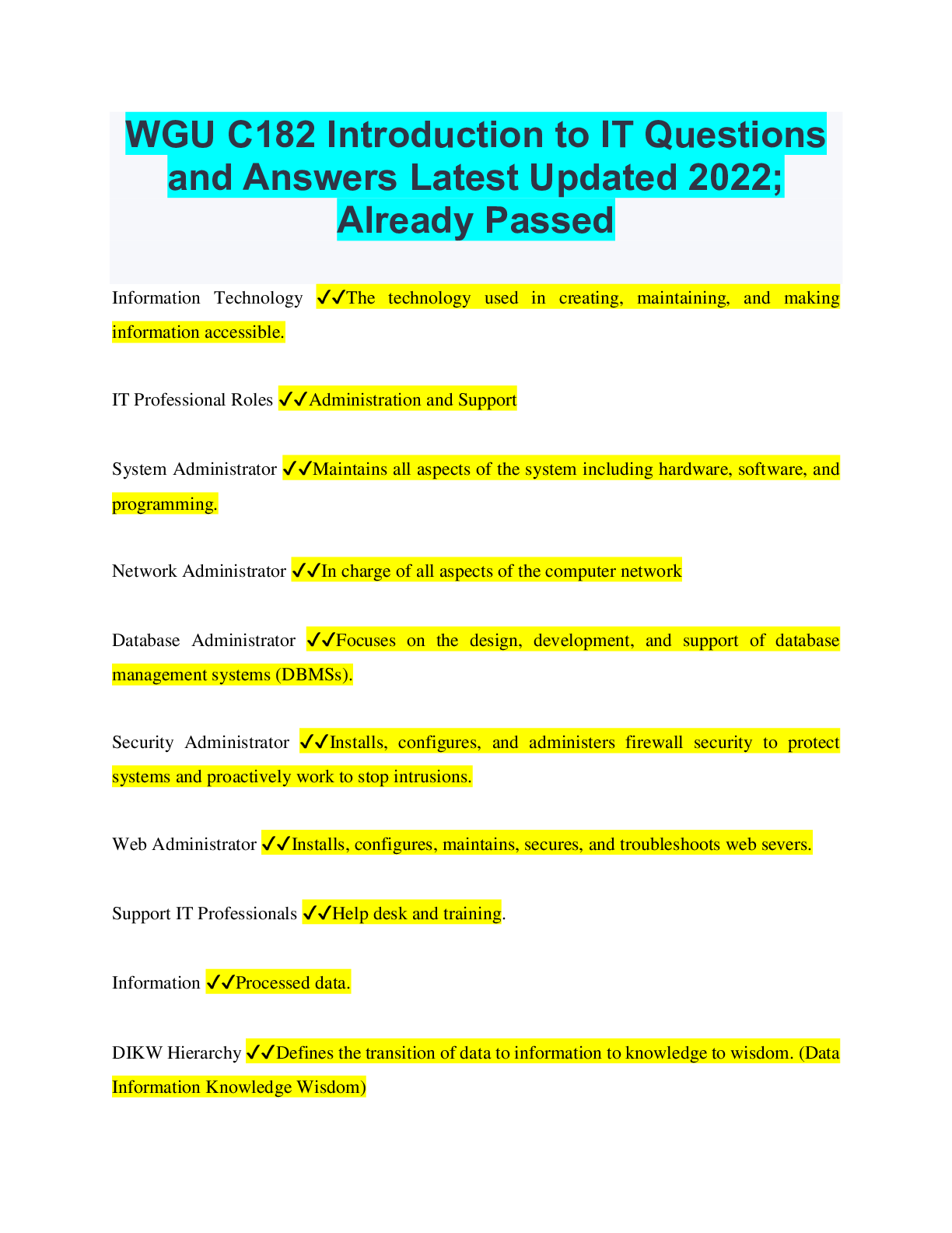 Information Technology > QUESTIONS & ANSWERS > WGU C182 Introduction to IT Study Guide Already Passed (All)