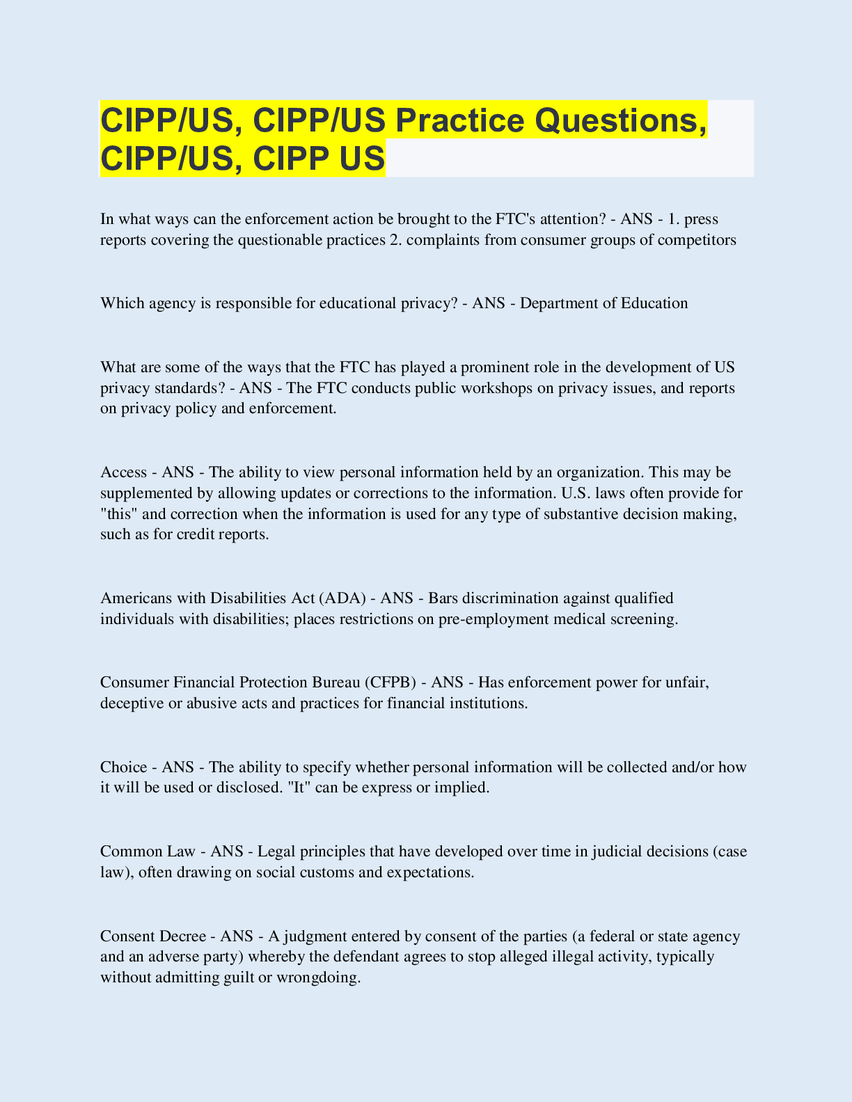 Information Technology > QUESTIONS & ANSWERS > CIPP/US Practice Questions (All)