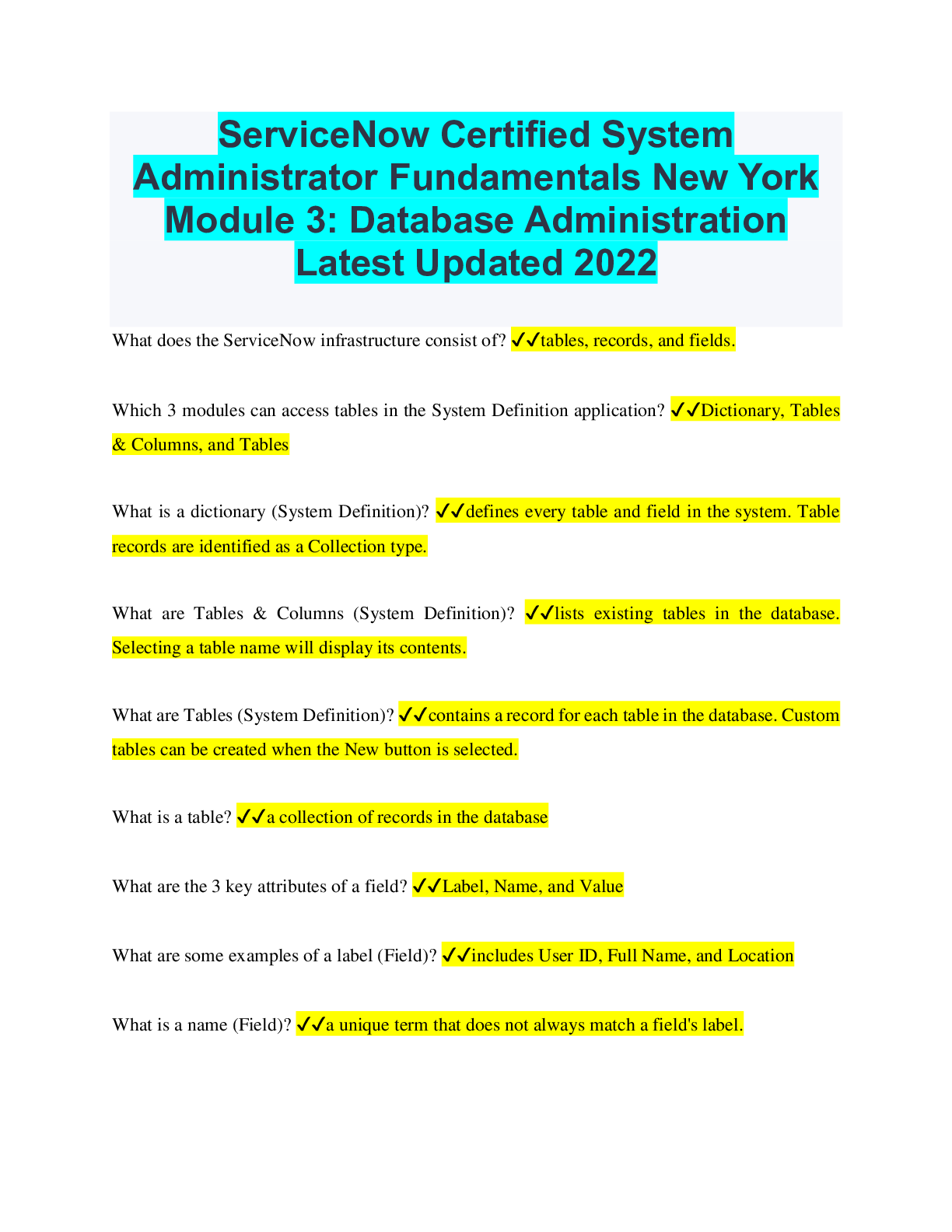 Information Technology > EXAM > ServiceNow Certified System Administrator Fundamentals New York Module 3: Database Administration Latest Updated 2022 (All)