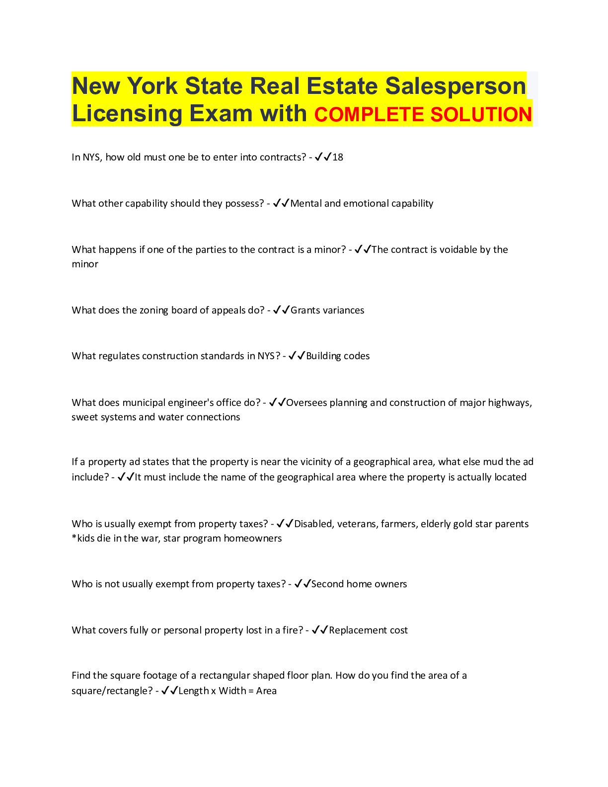 Labour Law > EXAM > New York State Real Estate Salesperson Licensing Exam with COMPLETE SOLUTION (All)