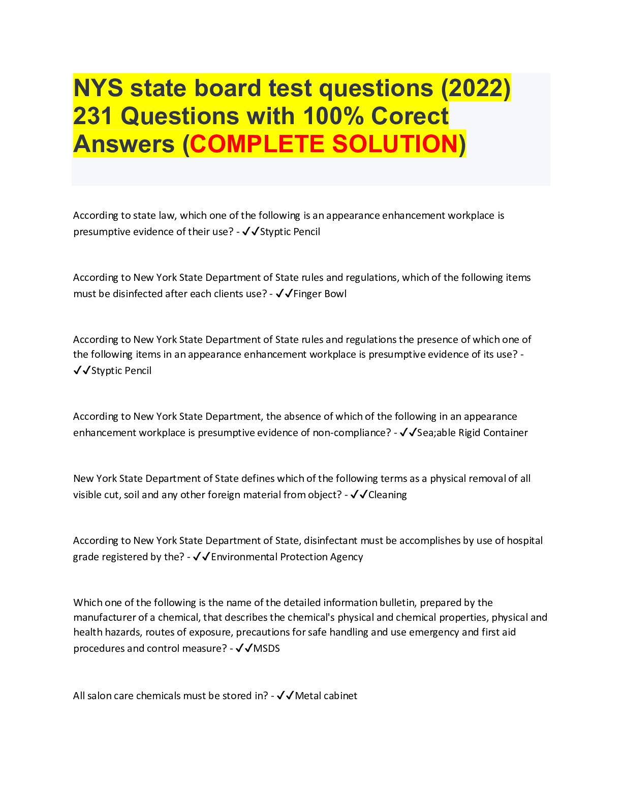 Labour Law > EXAM > NYS state board test questions (2022) 231 Questions with 100% Corect Answers (COMPLETE SOLUTION) (All)