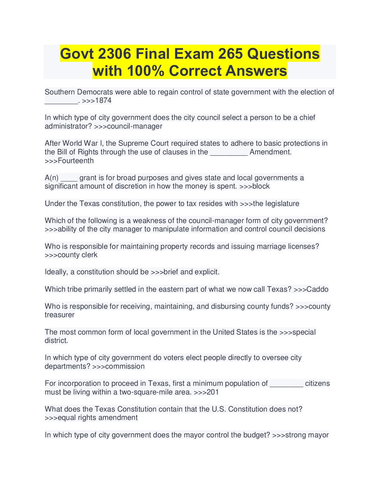 Government > QUESTIONS & ANSWERS > Govt 2306 Final Exam 265 Questions with 100% Correct Answers (All)