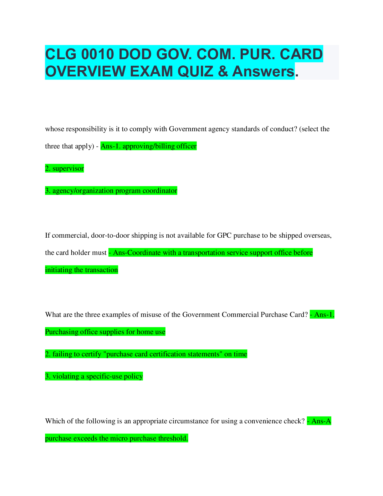 Government > QUESTIONS & ANSWERS > CLG 0010 DOD GOV. COM. PUR. CARD OVERVIEW EXAM QUIZ & Answers. (All)