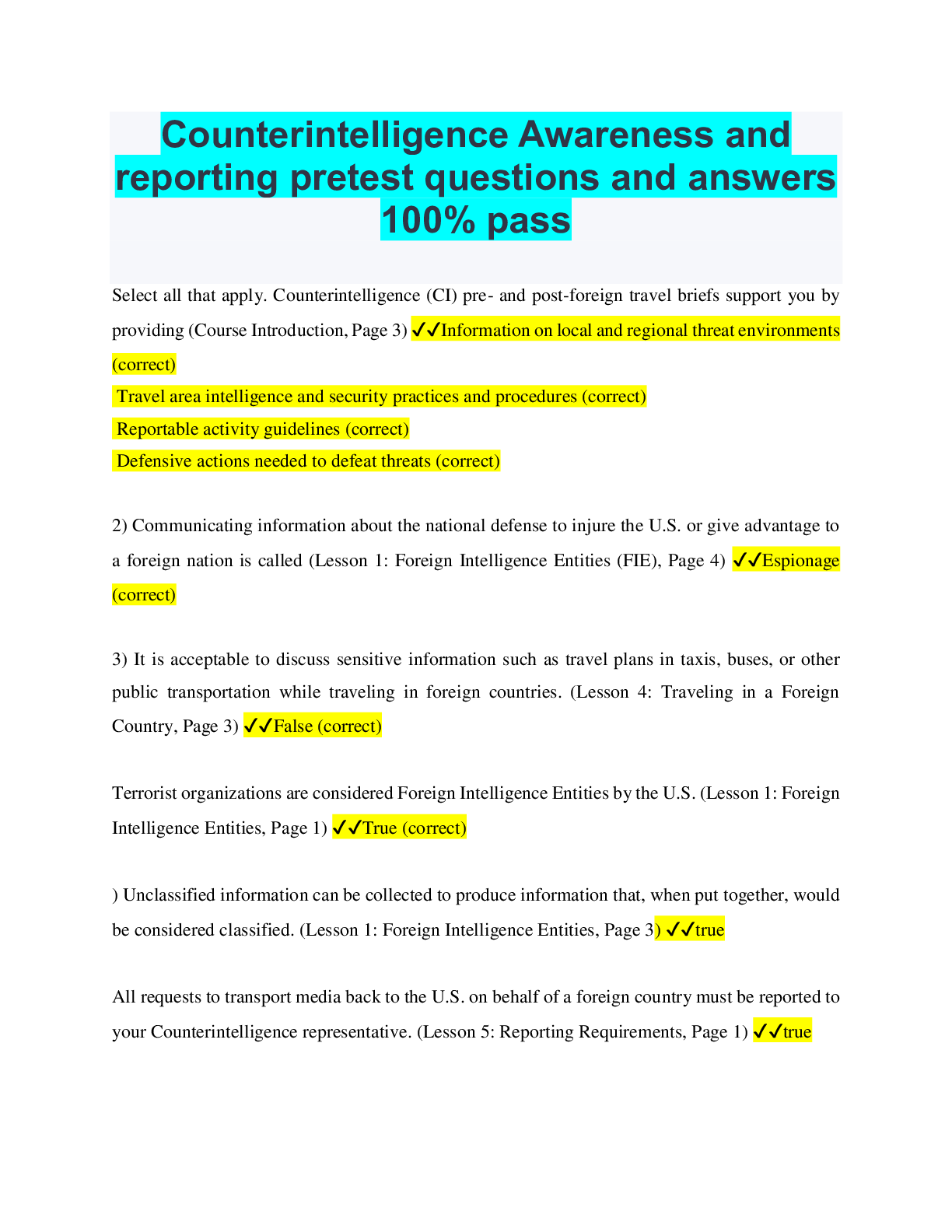 Government > QUESTIONS & ANSWERS > Counterintelligence Awareness and reporting pretest questions and answers 100% pass (All)