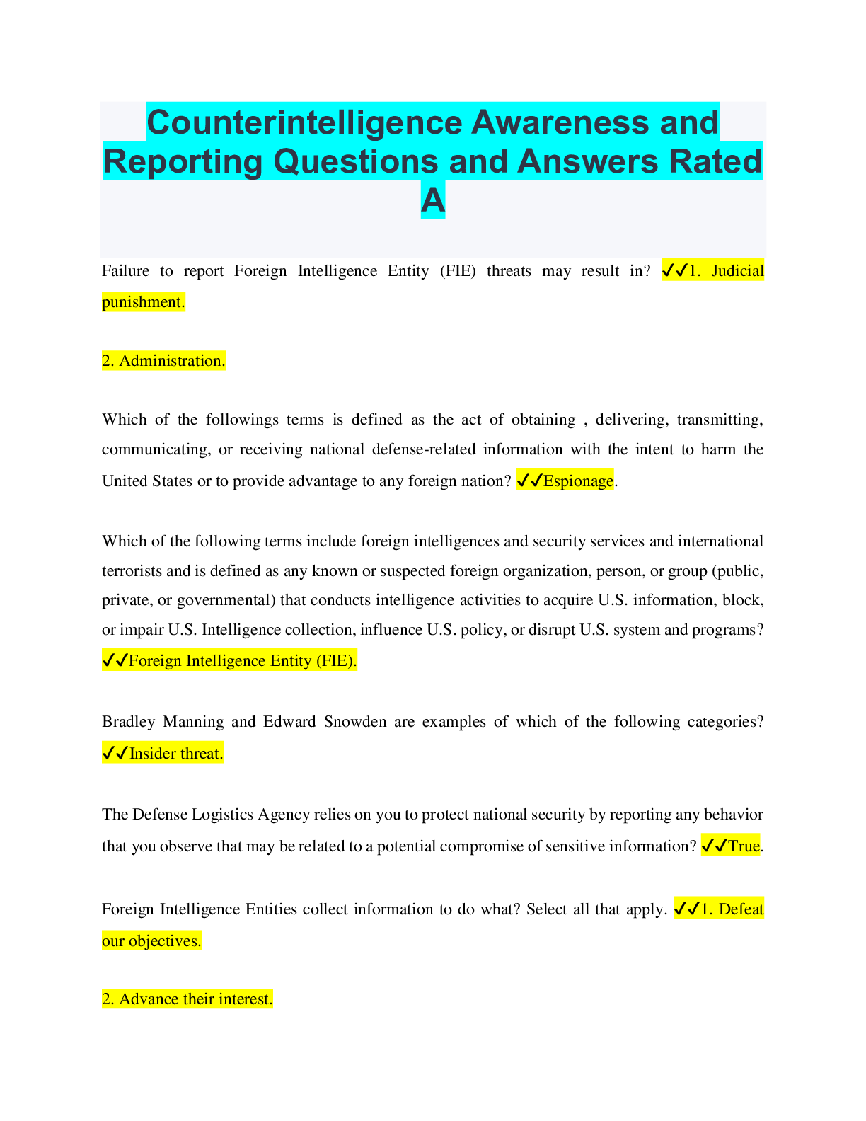 Government > QUESTIONS & ANSWERS > Counterintelligence Awareness and Reporting Questions and Answers Rated A (All)