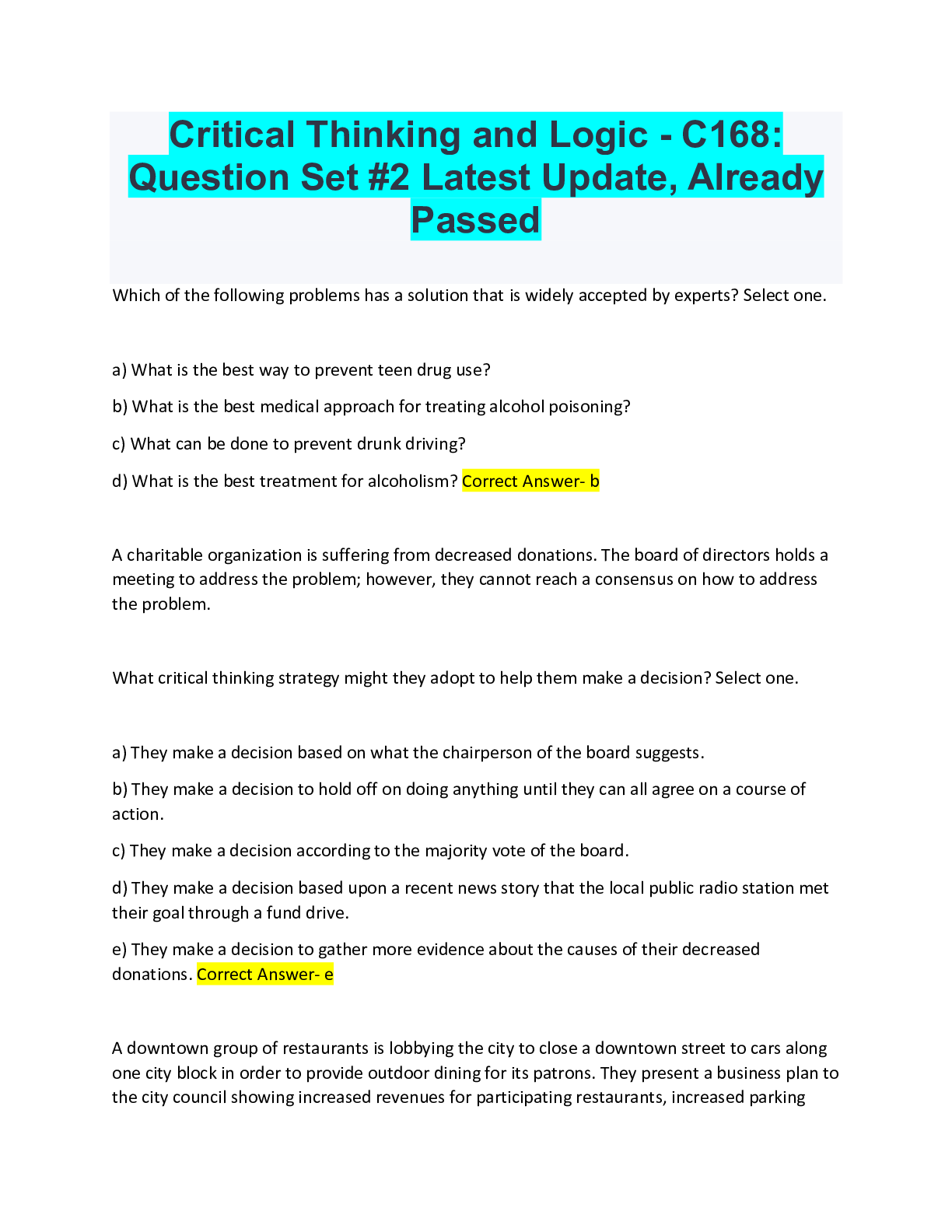 Critical Thinking > QUESTIONS & ANSWERS > Critical Thinking and Logic - C168: Question Set #2 Latest Update, Already Passed (All)