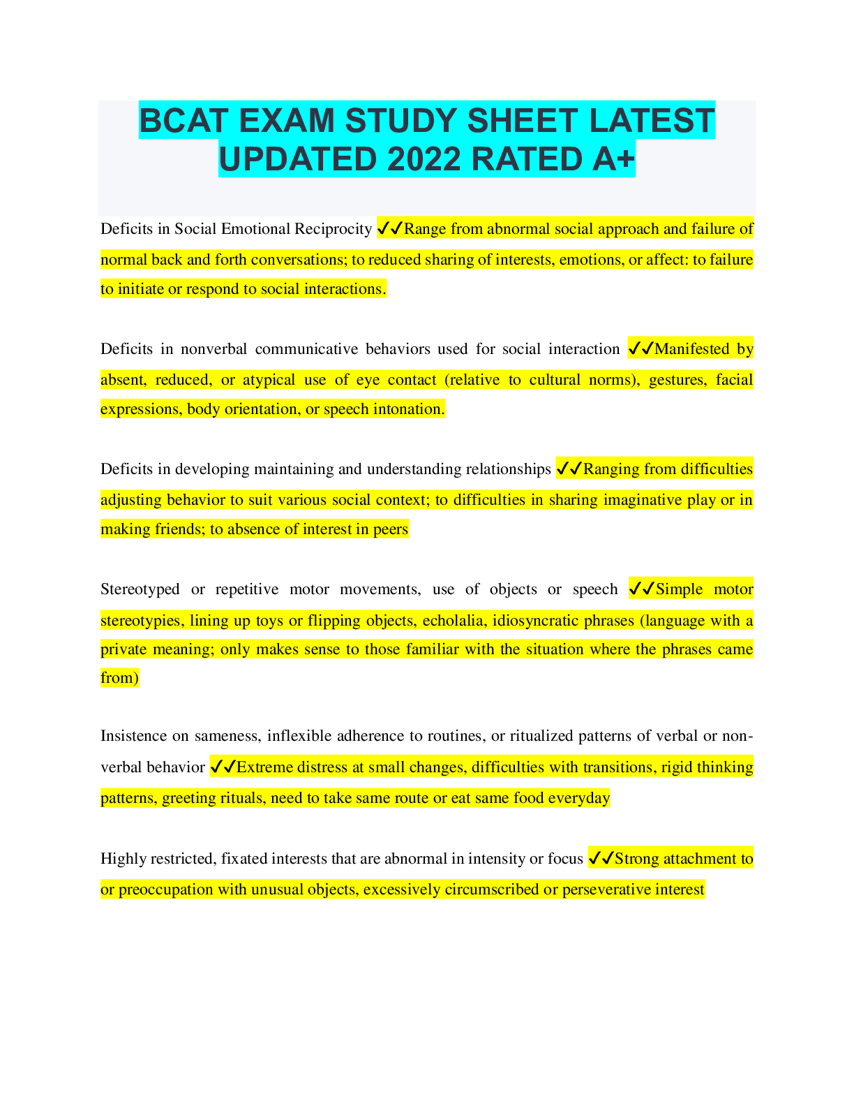Critical Thinking > QUESTIONS & ANSWERS > BCAT EXAM STUDY SHEET LATEST UPDATED 2022 RATED A+ (All)