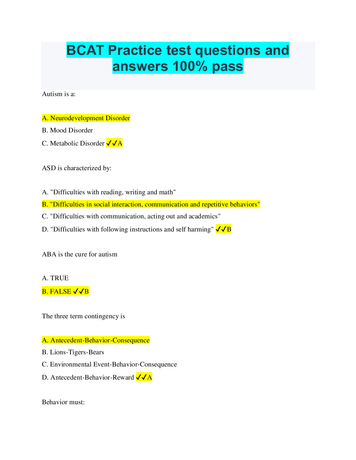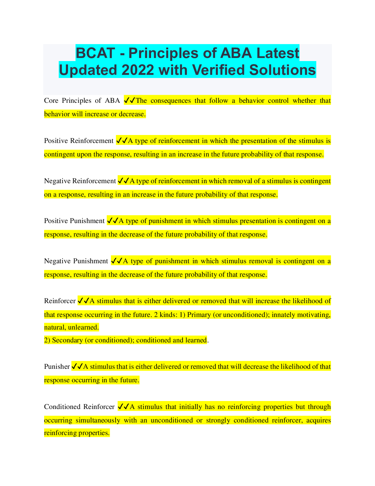 Critical Thinking > QUESTIONS & ANSWERS > BCAT - Principles of ABA Latest Updated 2022 with Verified Solutions (All)
