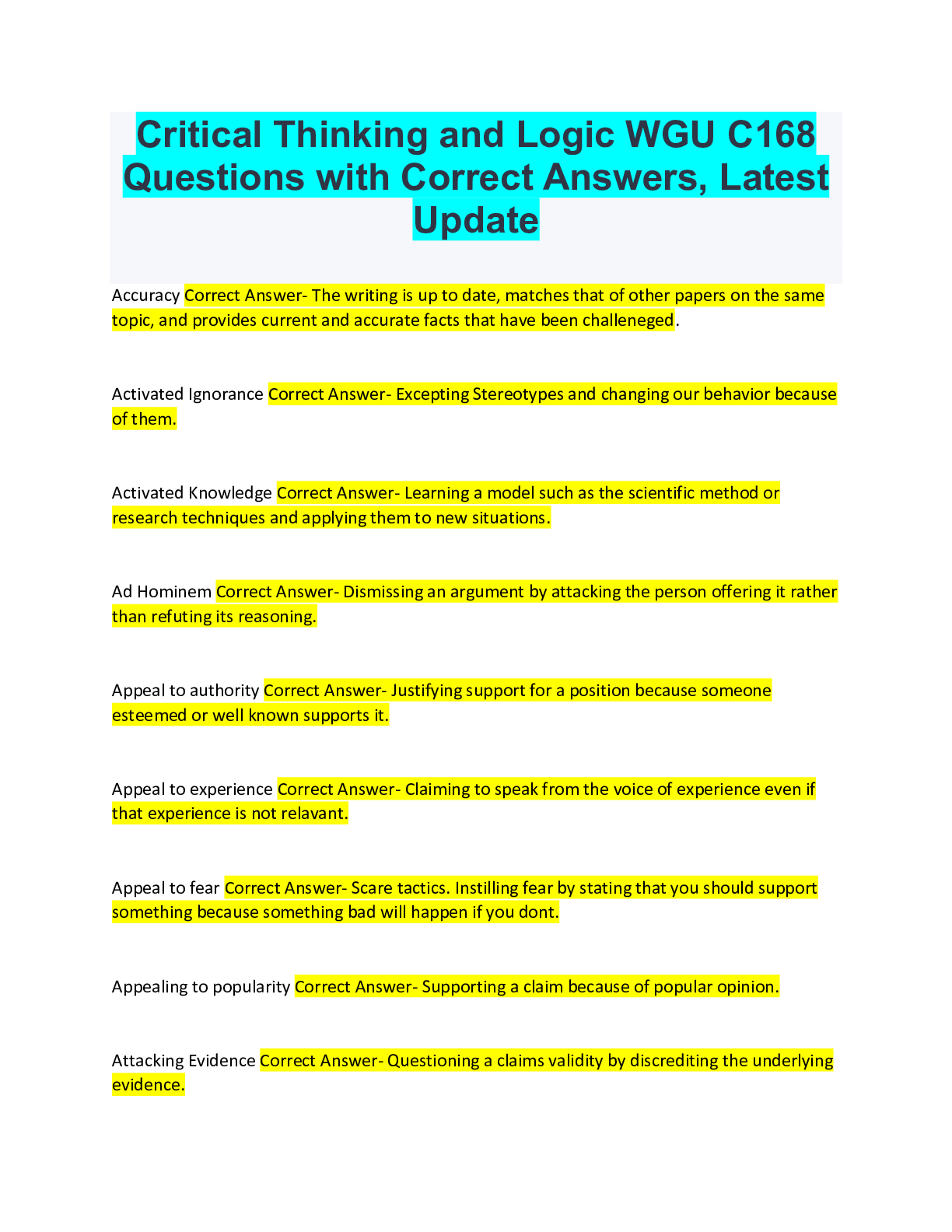 Critical Thinking > QUESTIONS & ANSWERS > Critical Thinking and Logic WGU C168 Questions with Correct Answers, Latest Update (All)