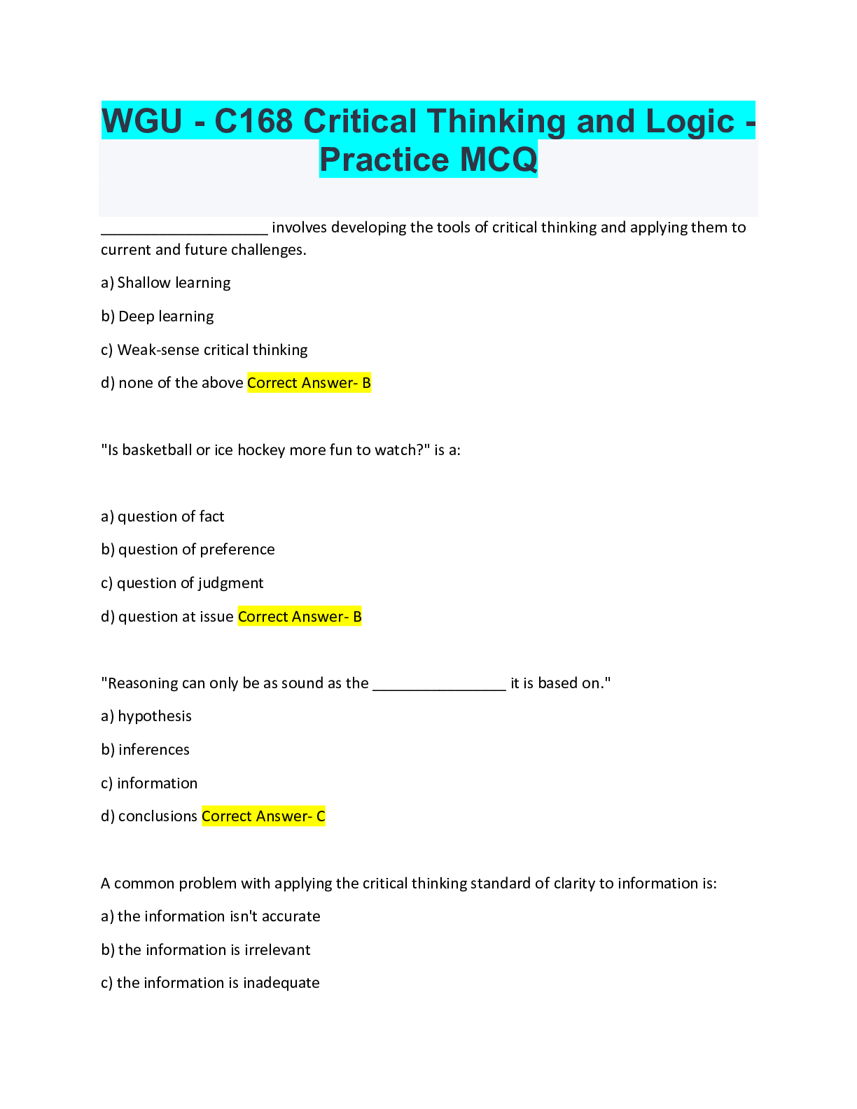 Critical Thinking > QUESTIONS & ANSWERS > WGU - C168 Critical Thinking and Logic - Practice MCQ (All)